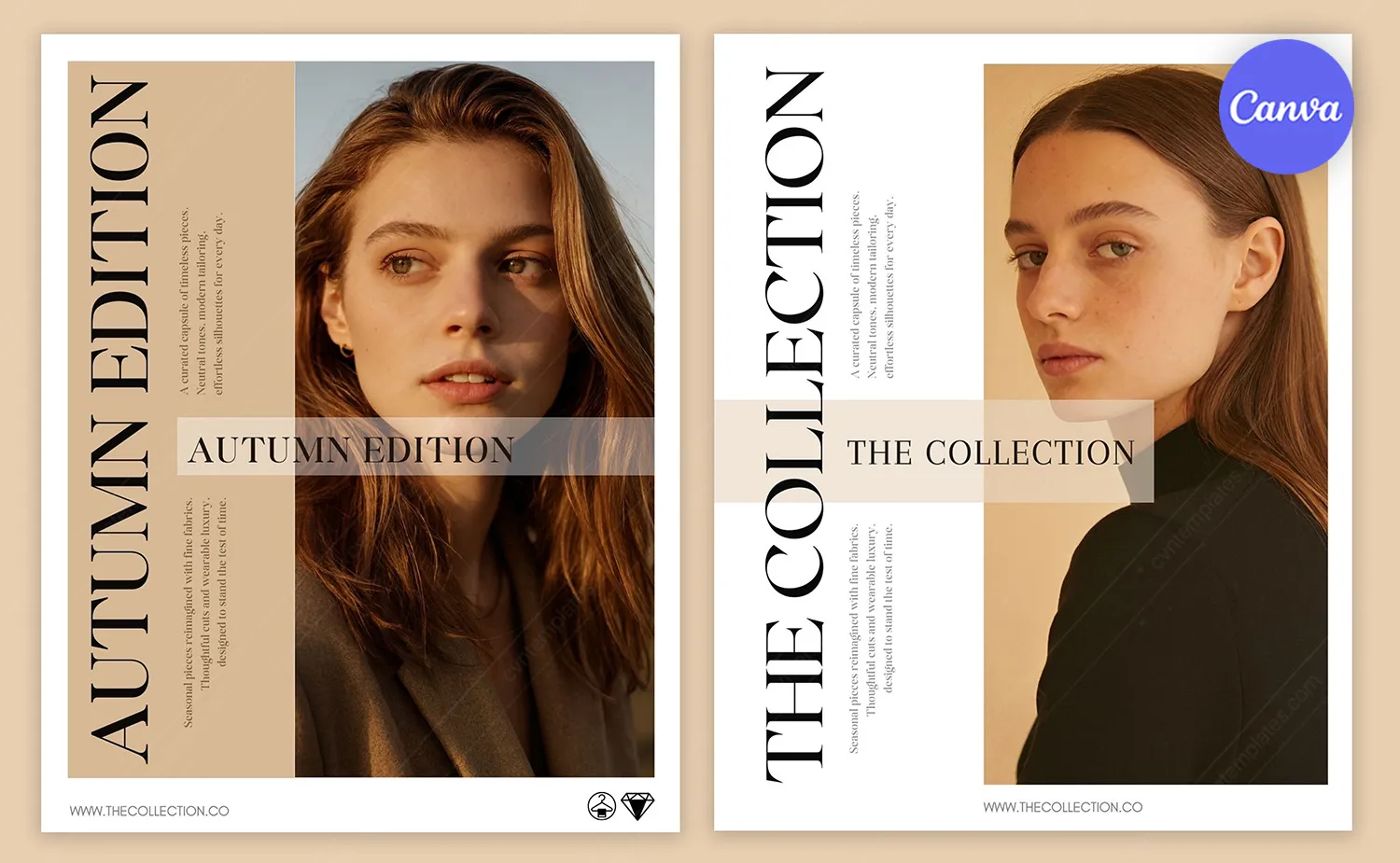 Capture the essence of seasonal fashion with this stunning free set of 2 Instagram post templates designed for editorial campaigns and collection launches. Featuring elegant vertical typography and warm autumn color palettes in beige, tan, and olive tones, these Canva templates exude sophistication and timeless style. The “AUTUMN EDITION” template showcases flowing natural hair and golden hour lighting, while “THE COLLECTION” design highlights minimalist fashion portraiture with clean composition. Both templates incorporate descriptive text blocks that create a magazine-quality editorial feel, perfect for announcing new collections, seasonal lookbooks, or fashion brand storytelling. The professional layout with carefully balanced negative space and serif typography ensures your Instagram posts convey premium quality and refined taste. This free template set is ideal for fashion designers, clothing boutiques, sustainable fashion brands, and style influencers who want to create cohesive seasonal campaigns that resonate with discerning audiences seeking authentic, thoughtful fashion content.