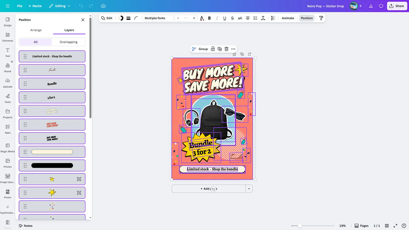 Promote bundle deals with this fun bundle deal Instagram story template featuring a coral pink buy more save more design. This bundle deal Instagram story template showcases a coral/salmon pink background with confetti creating a celebratory shopping atmosphere. The product bundle features a backpack, headphones, and sunglasses arranged attractively with a light blue arch backdrop. A yellow starburst badge announces the exciting “Bundle 3 for 2” deal. Price tags scattered around reinforce the savings theme effectively. The playful retro typography and tagline “Limited stock – Shop the bundle” create urgency that drives sales. Perfect for electronics retailers, accessories stores, back-to-school promotions, and lifestyle product bundle marketing campaigns.