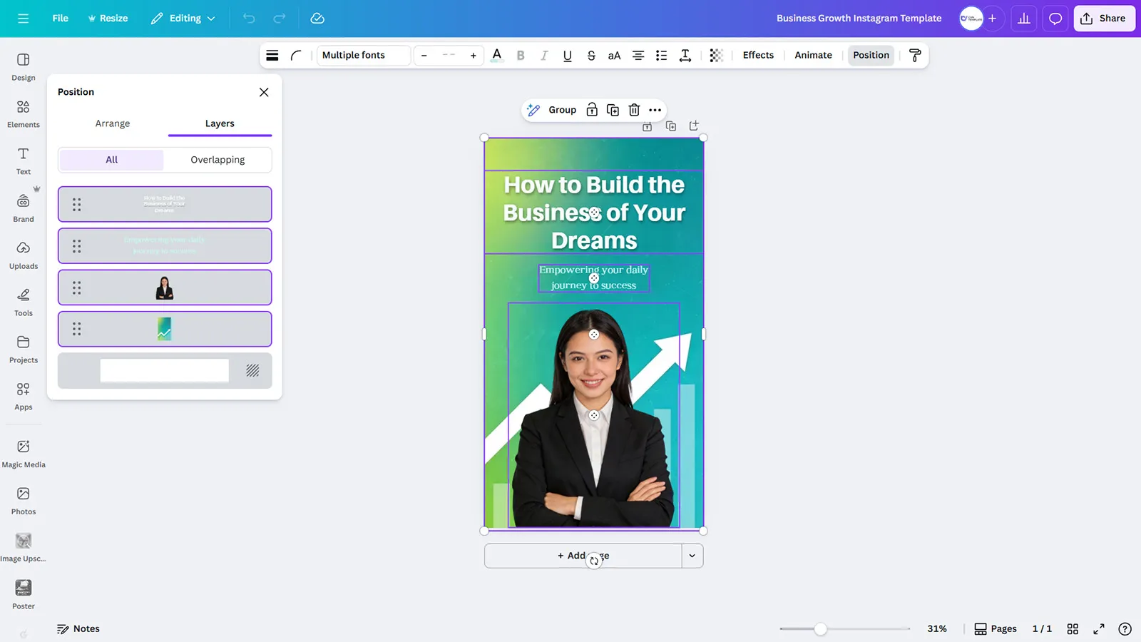 Inspire your audience with this motivational Instagram post template designed for entrepreneurs and business coaches. The eye-catching gradient background transitions from vibrant green to turquoise, creating an energetic and aspirational atmosphere. The bold headline “How to Build the Business of Your Dreams” immediately captures attention, while the supportive tagline “Empowering your daily journey to success” reinforces your commitment to client transformation.