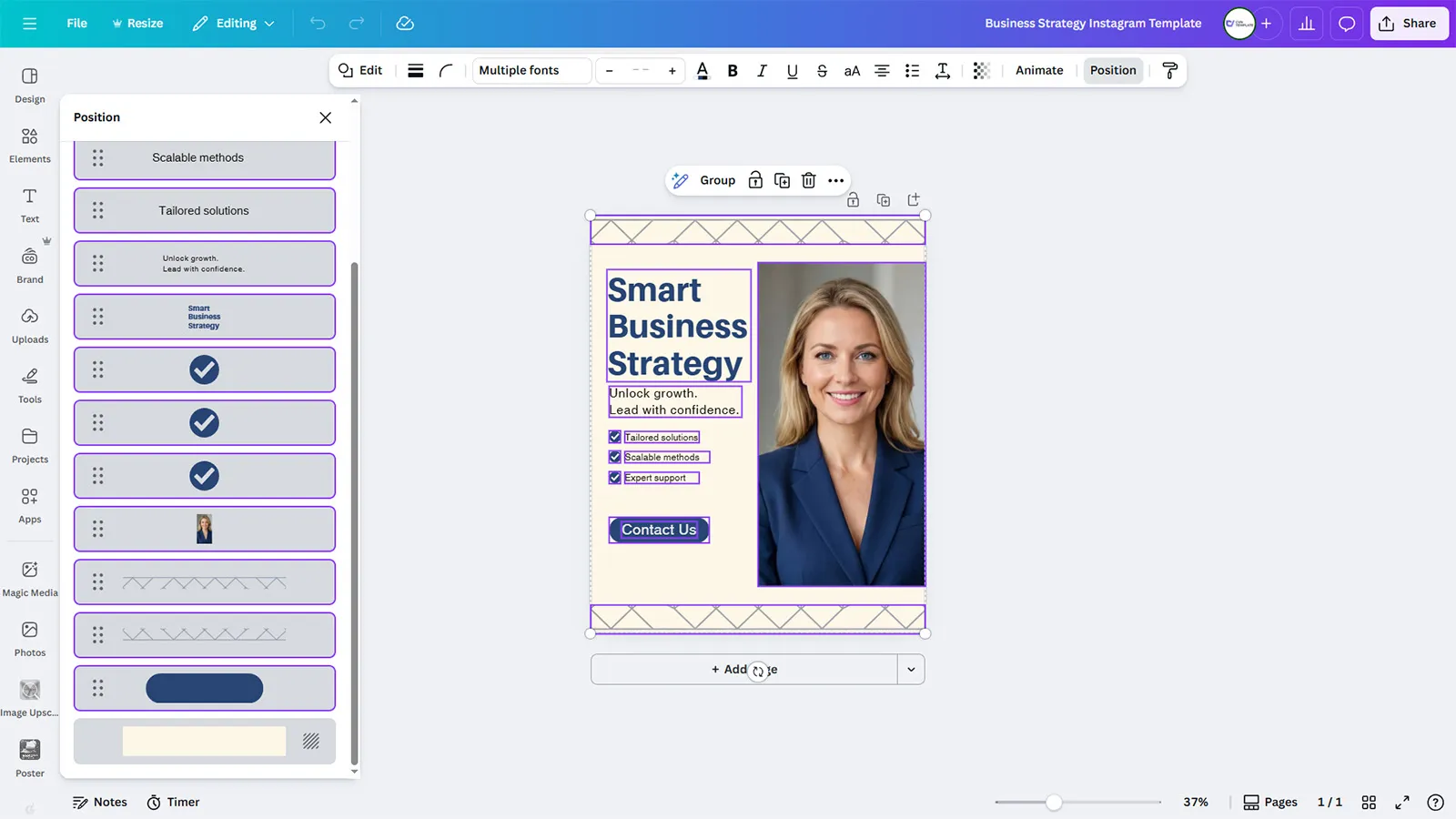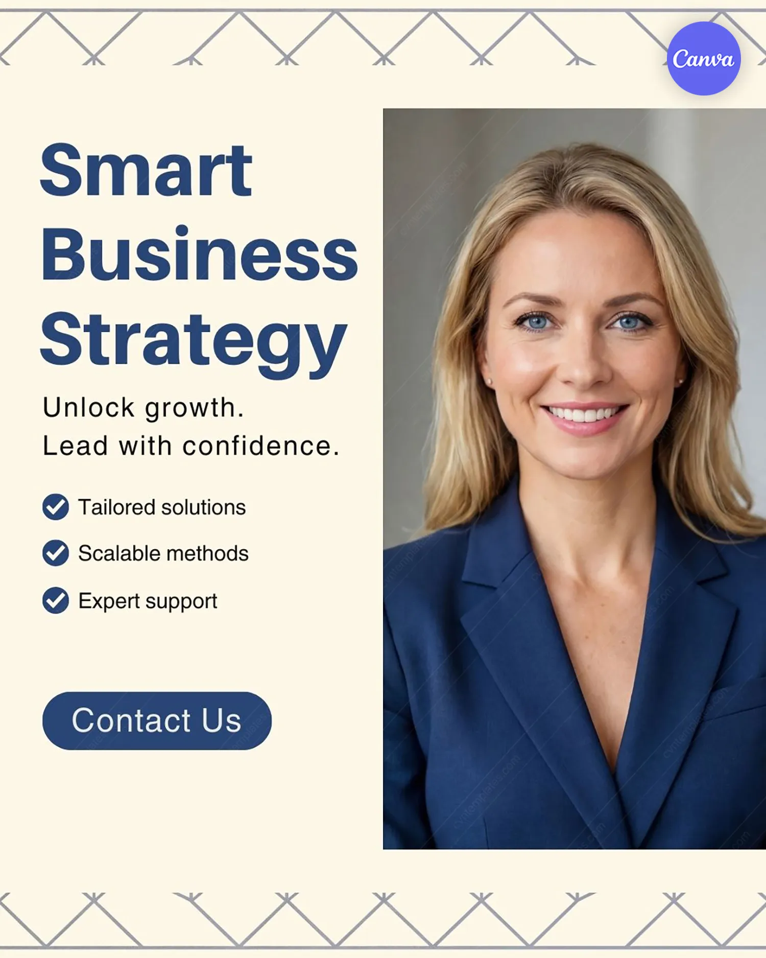 The template includes prominent placement for an executive-level professional photo and a clear “Contact Us” call-to-action button. The headline “Smart Business Strategy” with the empowering tagline “Unlock growth. Lead with confidence.” establishes authority and inspires action. Ideal for business consultants, strategy advisors, executive coaches, and B2B service providers who need to convey expertise and professionalism while remaining approachable and client-focused.
