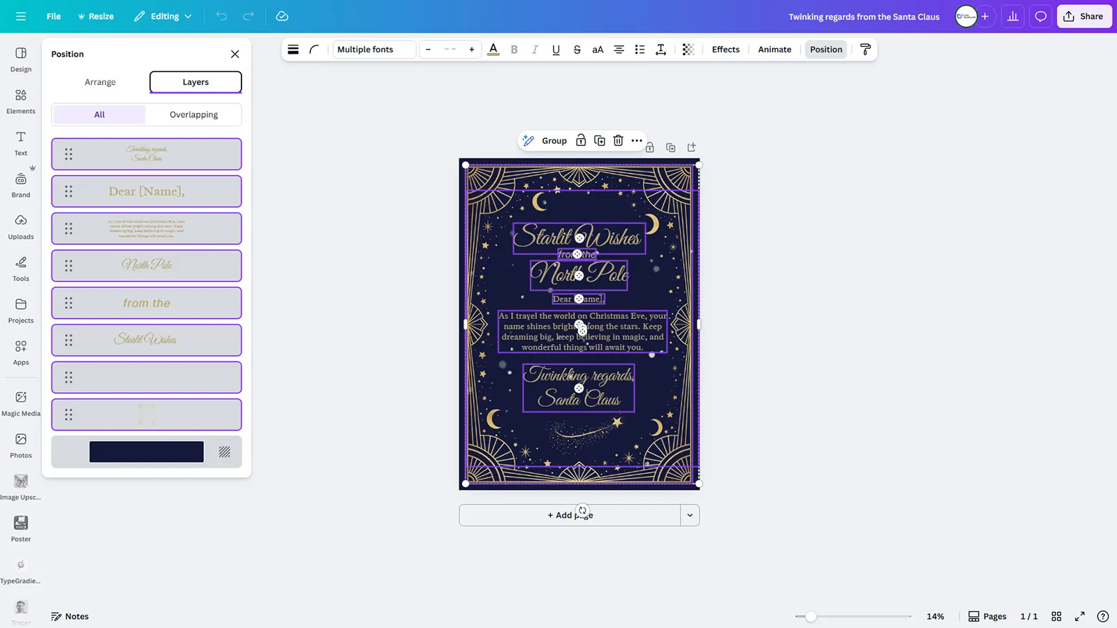 The sophisticated gold typography and celestial motifs create an atmosphere of wonder and dreams, perfect for encouraging children to believe in magic. This starry night letter from Santa template includes sparkling shooting stars and delicate constellation patterns that make every message feel like a wish upon a star. Personalize this beautiful Canva template to send twinkling regards from Santa Claus himself.