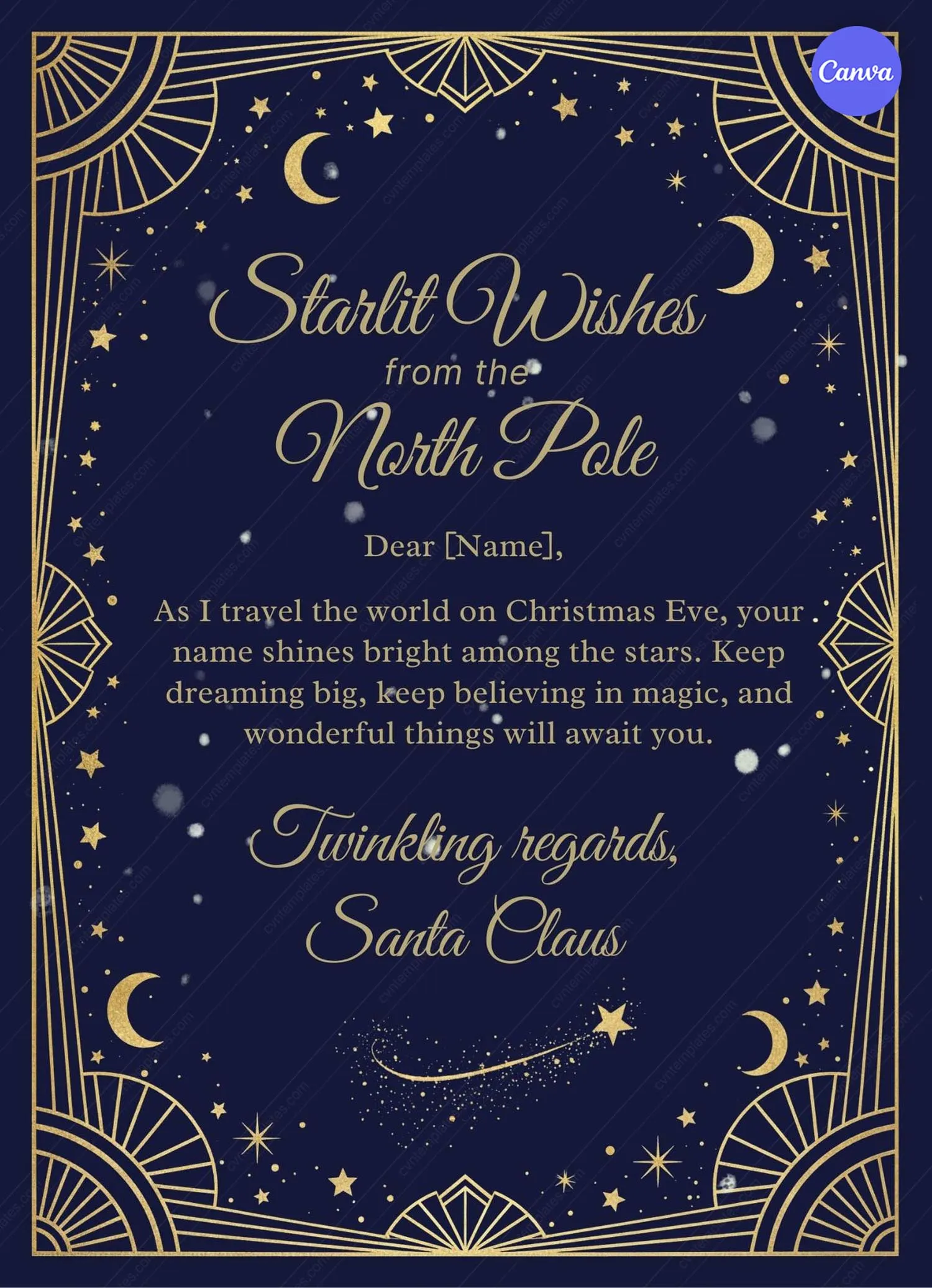 Capture the wonder of a magical Christmas Eve sky with this enchanting celestial-themed Santa letter template. Featuring a deep navy blue background illuminated by twinkling stars, golden crescent moons, and elegant Art Deco-inspired border elements, this design brings the mystical beauty of the North Pole starlit night to your holiday greetings.