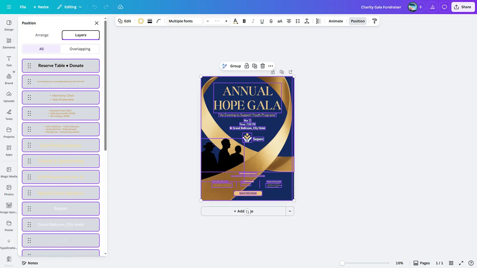 Need a charity gala event poster template to create an unforgettable invitation for your fundraiser? This luxurious, elegant Canva design features a sophisticated navy blue background with stunning 3D golden ribbon graphics and silhouette figures that exude prestige and celebration. The template includes organization logo placement, detailed event information, speaker and performer listings, ticket pricing tiers, and reserve table button. Perfect for nonprofit galas, charity auctions, formal fundraising dinners, and benefit events.