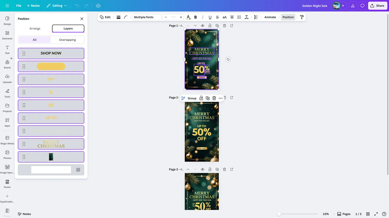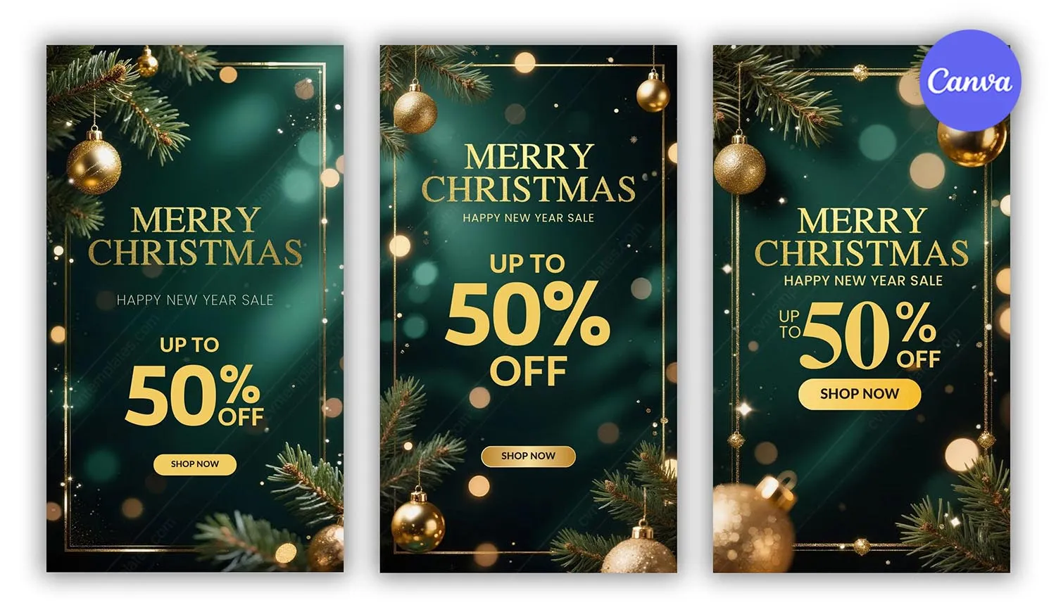Boost your holiday marketing with this stunning Christmas Instagram story template set featuring three coordinated designs. Each template showcases a luxurious emerald green background with golden Christmas ornaments, pine branches, bokeh lights, and elegant gold frame borders. The set displays Happy New Year Sale messaging with Up to 50% OFF and Shop Now buttons. This Christmas Instagram story template set offers slightly different layouts while maintaining brand consistency across all three designs. The rich green and gold color palette creates a festive yet sophisticated atmosphere. Perfect for fashion brands, retailers, and holiday promotional campaigns seeking cohesive multi-story content.