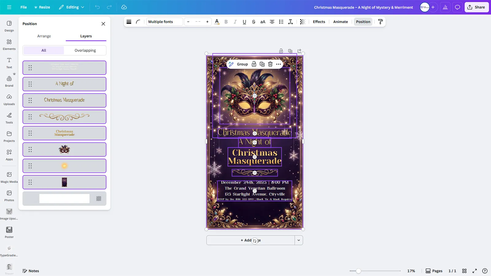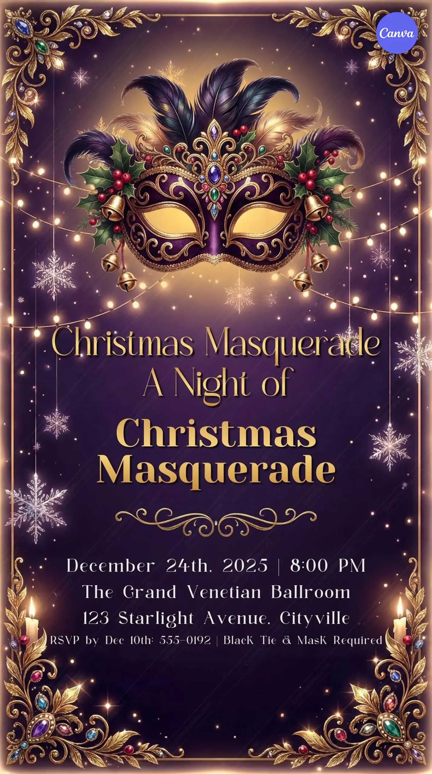 Set the stage for an extraordinary holiday celebration with this stunning Christmas masquerade invitation template. Featuring dramatic mask designs, rich festive colors, and elegant holiday accents, this Canva template promises your guests a night filled with mystery, merriment, and magical memories.