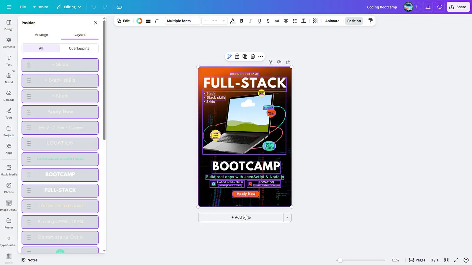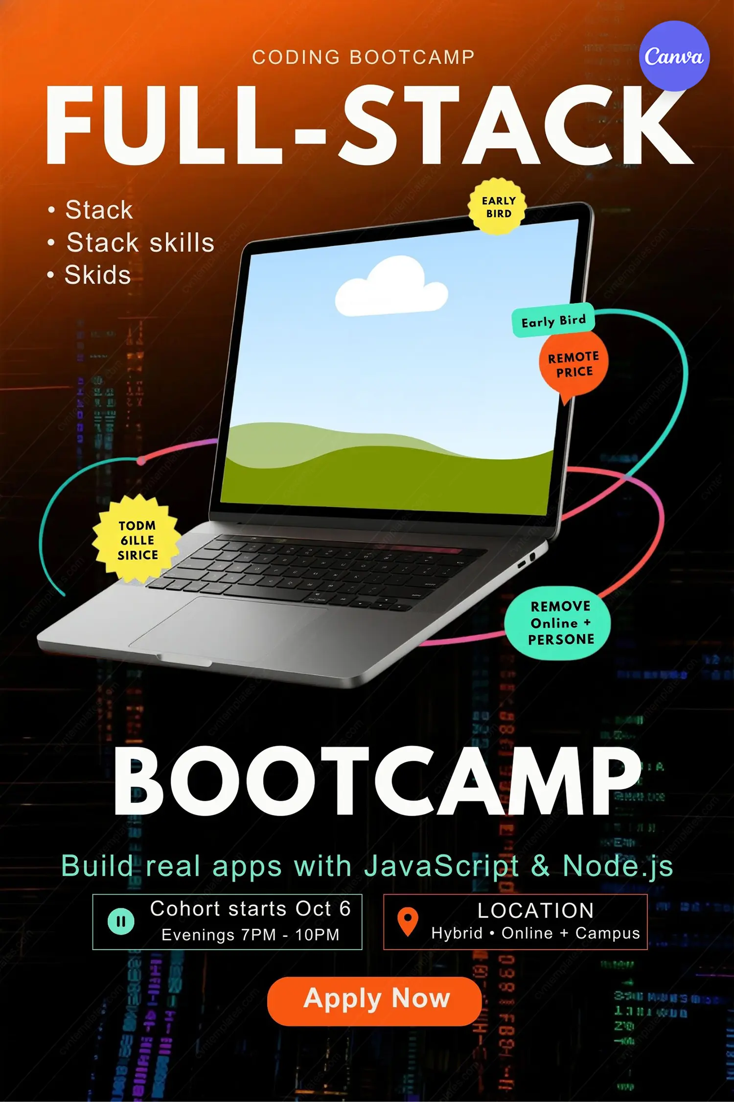 Promote your programming course with this eye-catching coding bootcamp poster template designed for Canva. Featuring a dynamic dark background with colorful code visuals and a floating laptop graphic surrounded by vibrant callout badges, this template captures the excitement of learning to code. The design includes curriculum highlights, cohort start date, schedule details, hybrid location options, and an apply now button. Perfect for coding bootcamps, web development courses, JavaScript training programs, and tech education academies looking to recruit aspiring developers.