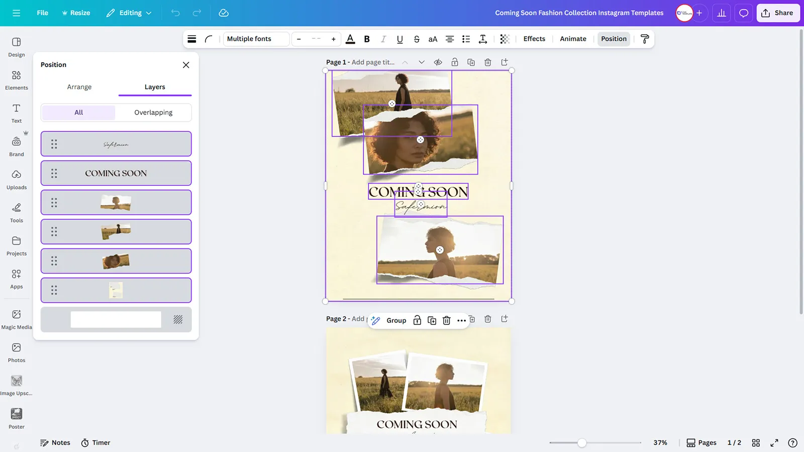 Build anticipation and create buzz for your upcoming fashion collection with this sophisticated set of 2 “Coming Soon” Instagram post templates. These Canva designs feature elegant torn paper photo collages arranged against soft sage green backgrounds with warm beige accents, perfectly capturing the essence of editorial fashion announcements. The first template showcases 3 portrait-style fashion photographs arranged in an overlapping, dynamic composition with refined serif typography, while the second template presents 4 images in a grid-style layout with handwritten script accents.