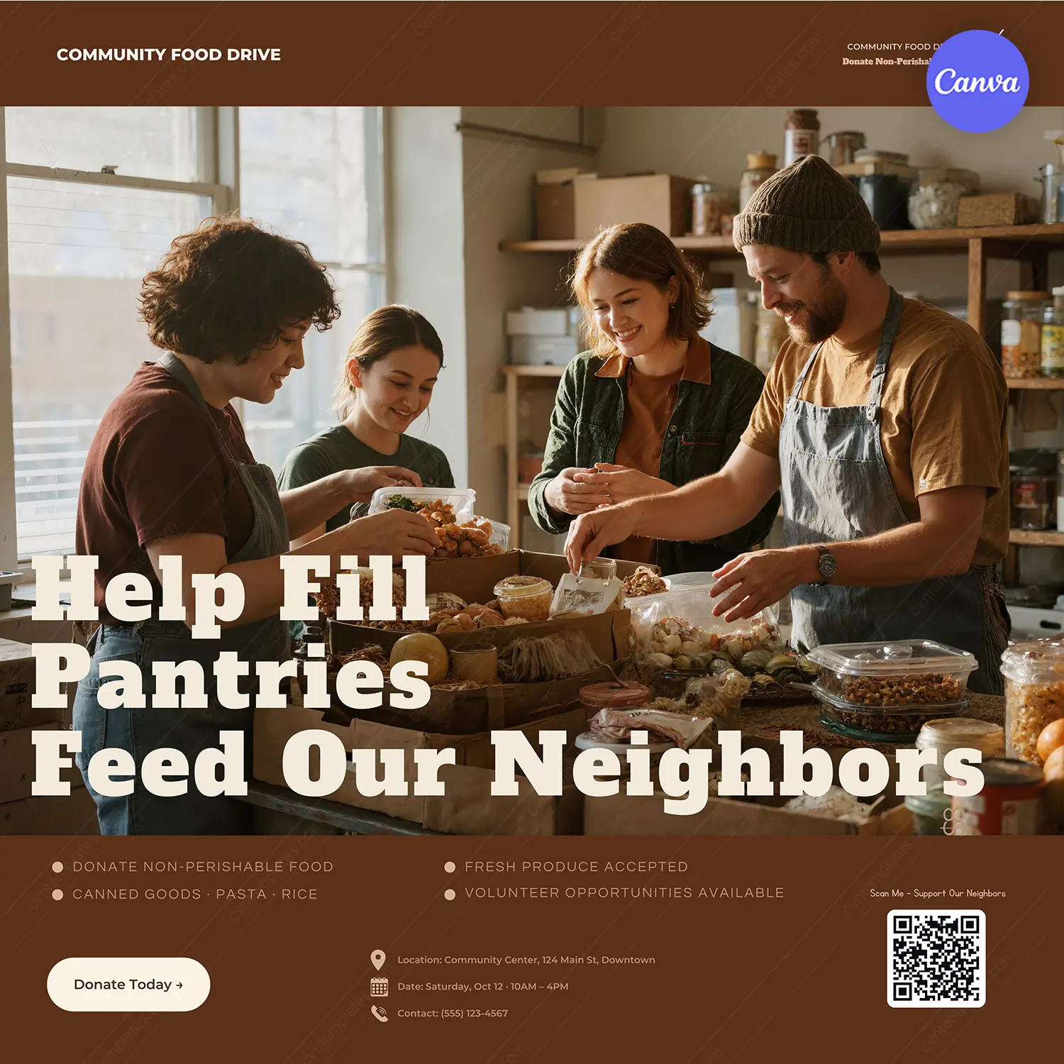 Looking for a community food drive poster template to inspire your neighborhood to give back? This warm, heartfelt Canva design features authentic photography of volunteers sorting donations in a pantry setting with rich brown earth tones that convey warmth and compassion. The template includes donation guidelines, location and date details, contact information, QR code for easy access, and a prominent donate button. Ideal for food banks, community centers, church food drives, and neighborhood donation campaigns.