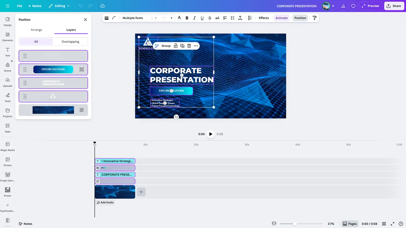 This Corporate Presentation video template is perfect for investor pitches, annual reports, business strategy videos, and executive presentations. The clean design includes bullet points for Innovative Strategies, Global Reach & Impact, and Future-Forward Technology, plus an Explore Solutions call-to-action that drives engagement. The sophisticated blue color scheme conveys trust, professionalism, and corporate excellence. Fully customizable in Canva to align with your company branding.