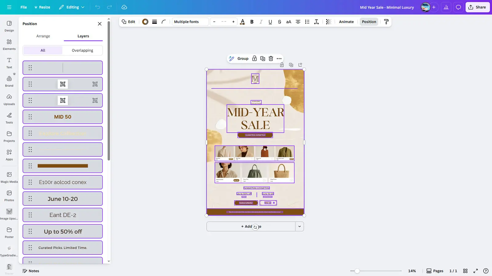 Need a fashion sale poster template to drive traffic to your seasonal promotion? This elegant, minimalist Canva design features a sophisticated beige and gold color palette with curated product photography grid that communicates luxury and style. The template includes product cards with pricing, discount percentage display, sale dates, promo code, explore collection button, and brand messaging. Perfect for fashion boutiques, clothing sales, mid-year clearances, and designer promotions.