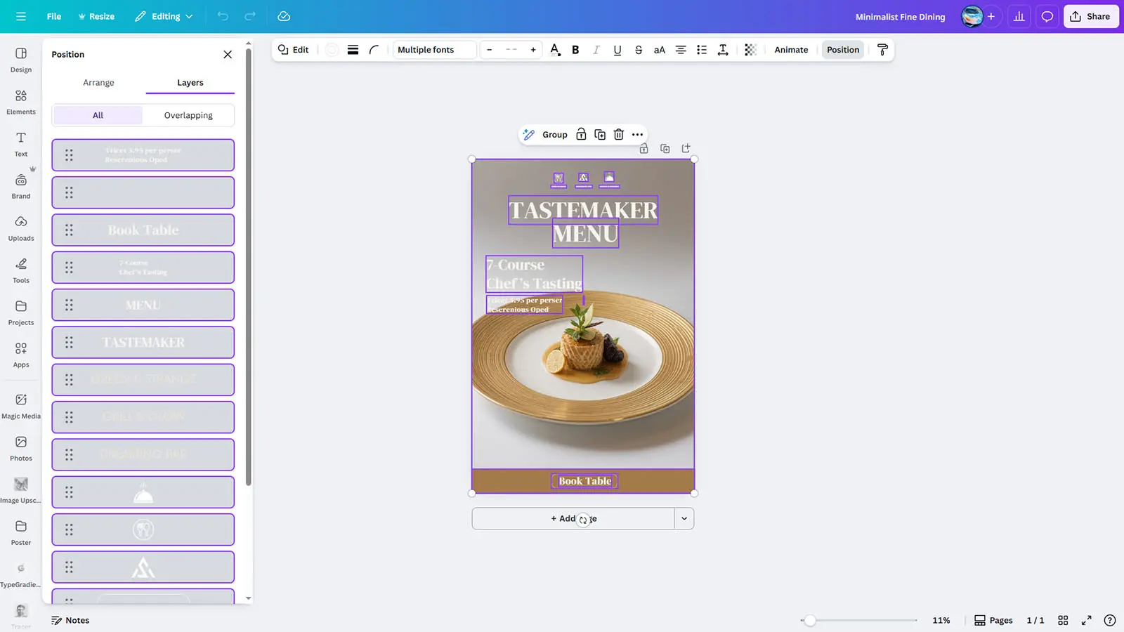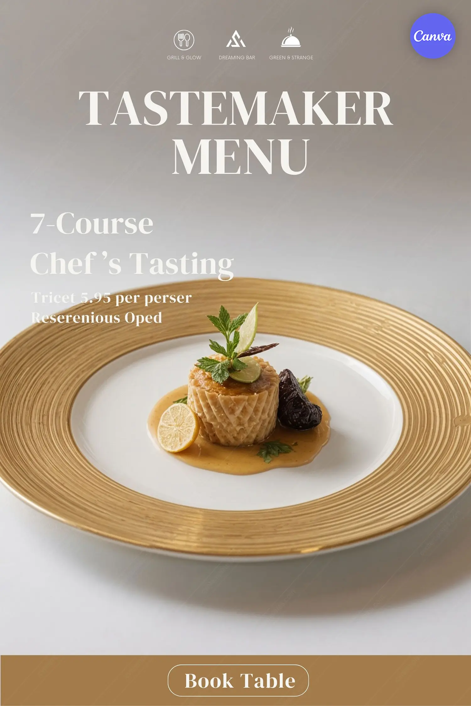 Searching for a fine dining menu poster template to elevate your upscale restaurant’s image? This luxurious, sophisticated Canva design features elegant gold-rimmed plating with exquisite food presentation that exudes refinement and culinary excellence. The template includes partner restaurant logos, tasting menu details, pricing information, and book table button with gold accent bar. Perfect for fine dining establishments, chef’s tasting menus, gourmet restaurants, and upscale culinary events.