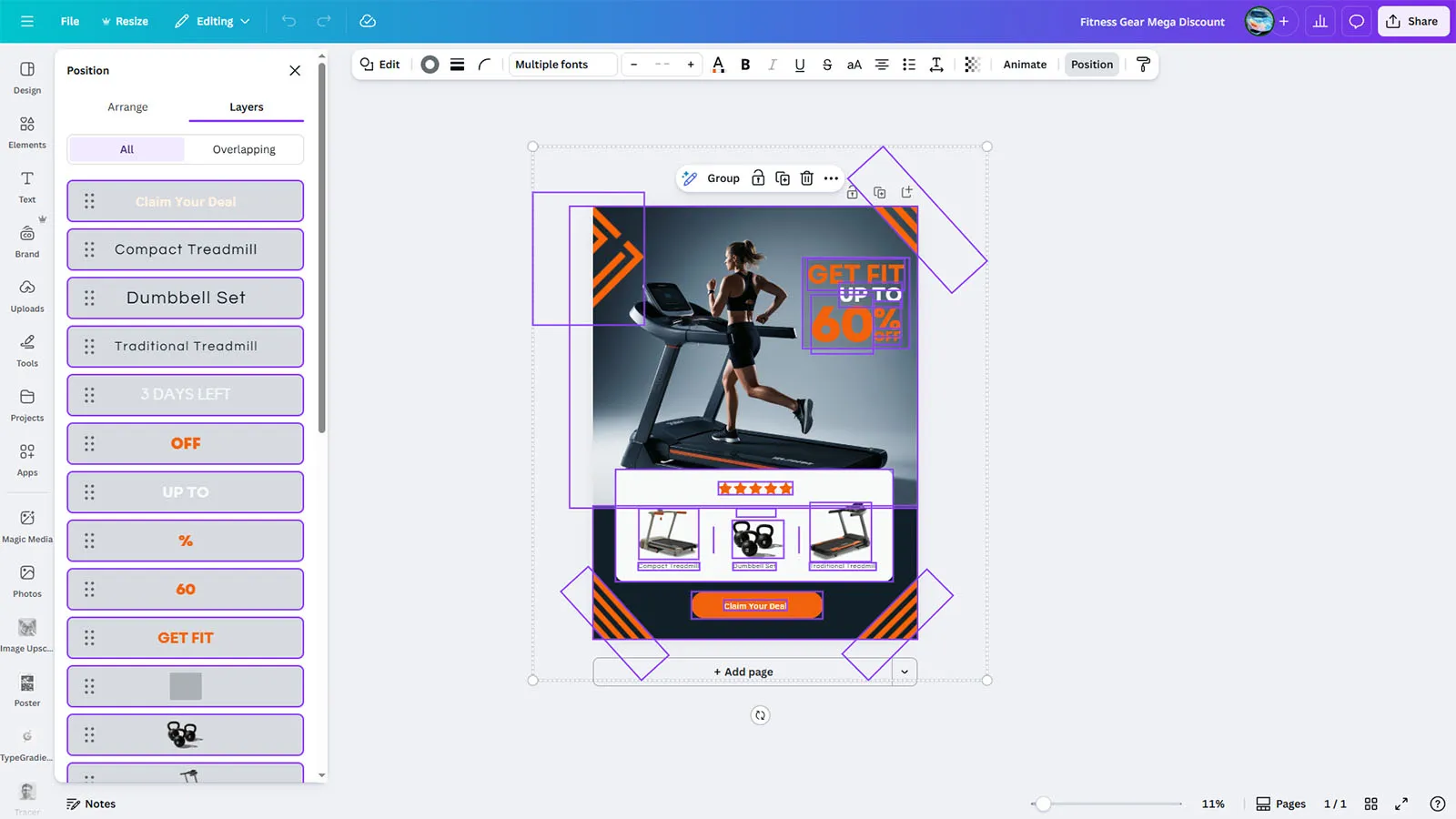 This fitness equipment sale flyer template motivates customers with dynamic energy that drives conversions. Designed for Canva, this energetic template features a bold navy and orange color scheme, action photography of a woman running on a treadmill, and prominent 60% off discount messaging. Perfect for fitness equipment retailers, gym supply stores, and sporting goods shops promoting exercise equipment deals and seasonal fitness promotions. The professionally designed layout showcases featured products including treadmills, dumbbells, and kettlebells with 5-star ratings, plus a compelling claim your deal call-to-action button. The dynamic diagonal stripe accents create energy and movement that inspires action.