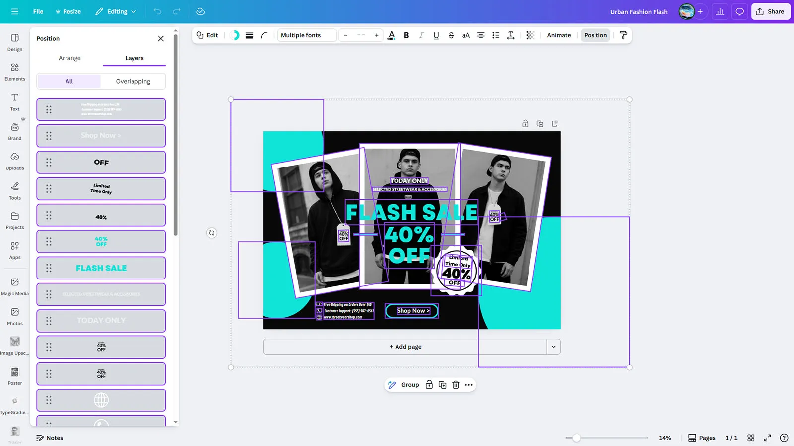 This flash sale flyer template drives sales with bold visual impact that creates urgency. Designed for Canva, this striking template features a modern black and cyan color scheme, black and white fashion photography, and prominent 40% off messaging that captures attention. Perfect for streetwear brands, fashion retailers, and clothing stores promoting flash sales, limited-time discounts, and seasonal clearance events. The wide landscape format strategically showcases multiple product images with price tags, free shipping threshold messaging, customer support contact, and prominent shop now call-to-action. Creates urgency with limited time only badges and today only promotional text that converts browsers into buyers.