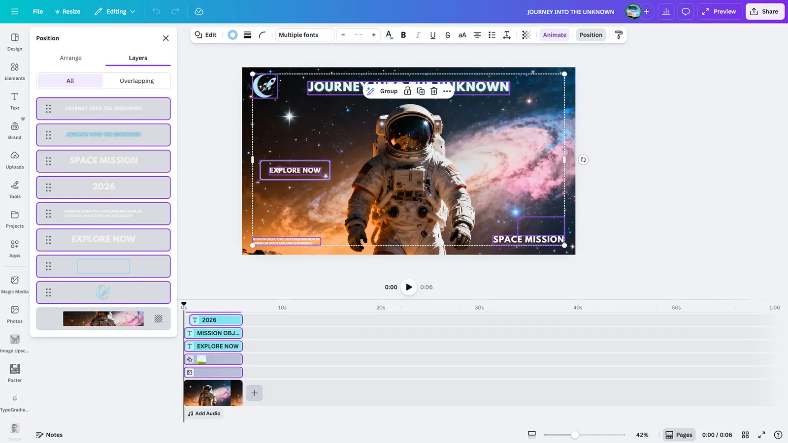 Inspire exploration and adventure with this epic free astronaut video template for Canva. Featuring a stunning astronaut against a colorful cosmic backdrop with galaxies and nebulae, this template captures the spirit of space exploration and discovery in every frame.