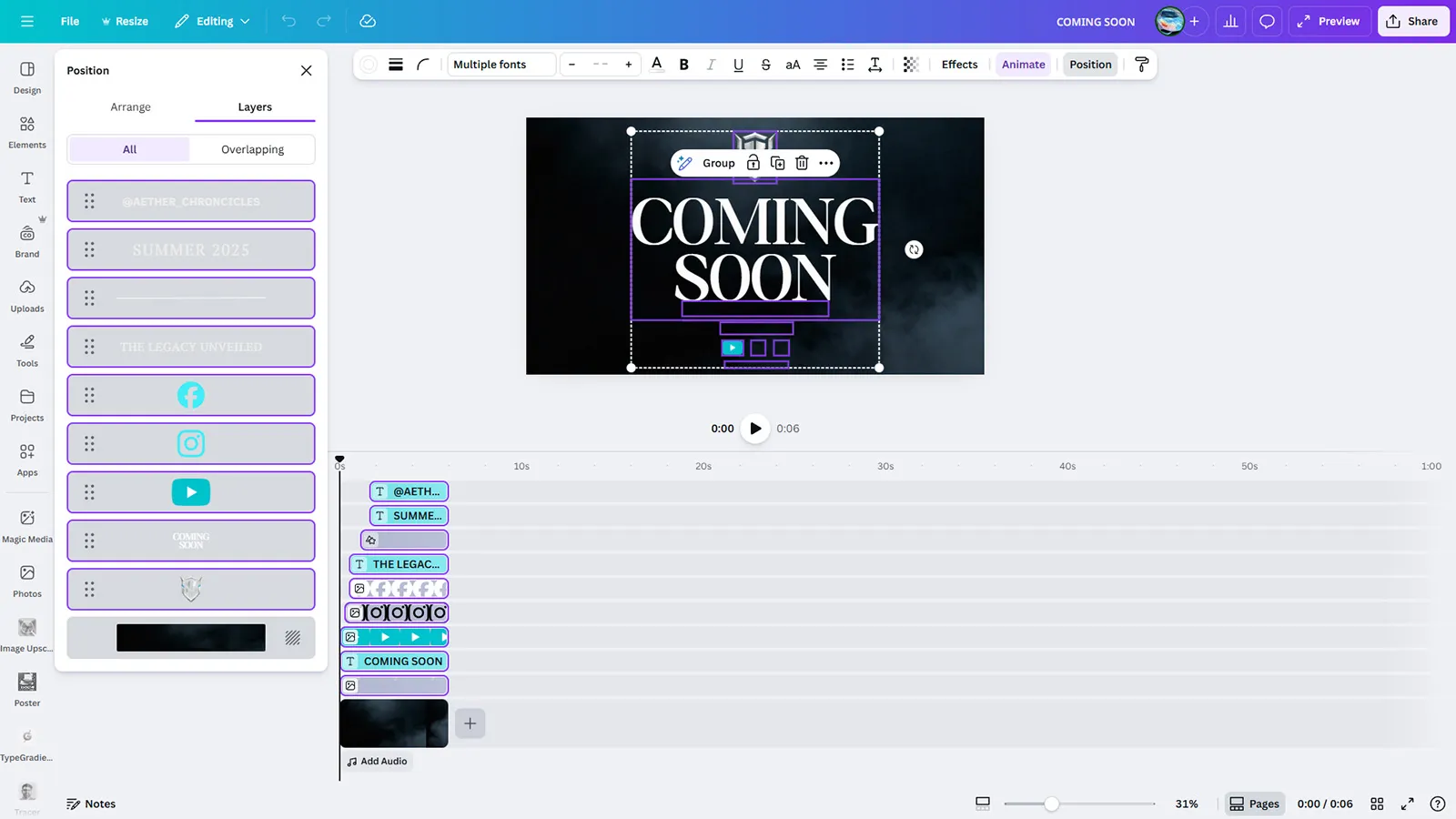 This free Coming Soon video template is perfect for luxury brand launches, movie trailers, high-end product reveals, and exclusive announcements seeking a refined aesthetic. The shield logo and play button element add to the cinematic feel that captivates audiences. The understated design lets your upcoming reveal take center stage while building excitement. Fully customizable in Canva to match your brand’s aesthetic and messaging.