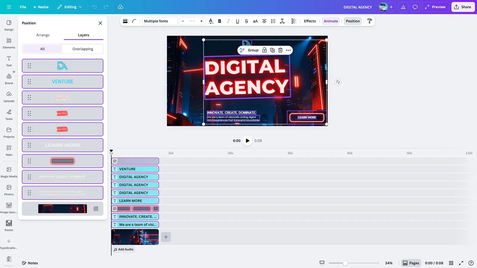 This free Digital Agency video template is perfect for digital marketing agencies, creative studios, and tech companies seeking to showcase their cutting-edge services. The futuristic urban backdrop with lightning effects creates an atmosphere of energy and transformation that commands attention. The bold tagline “Innovate. Create. Dominate.” and Learn More call-to-action drive engagement and conversions. Fully customizable in Canva to perfectly represent your agency branding.