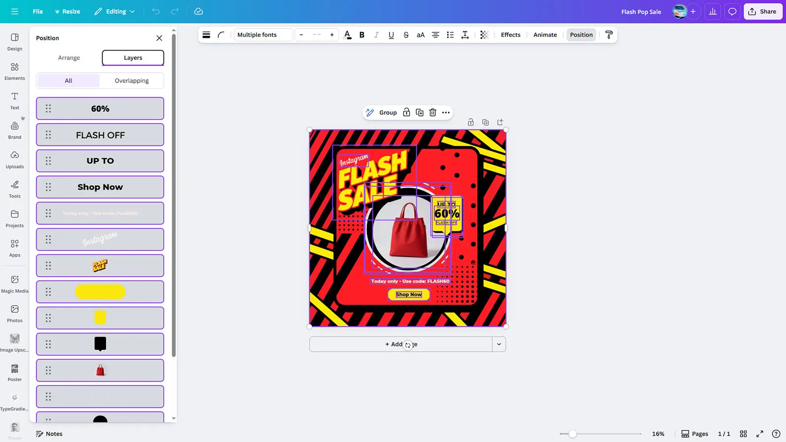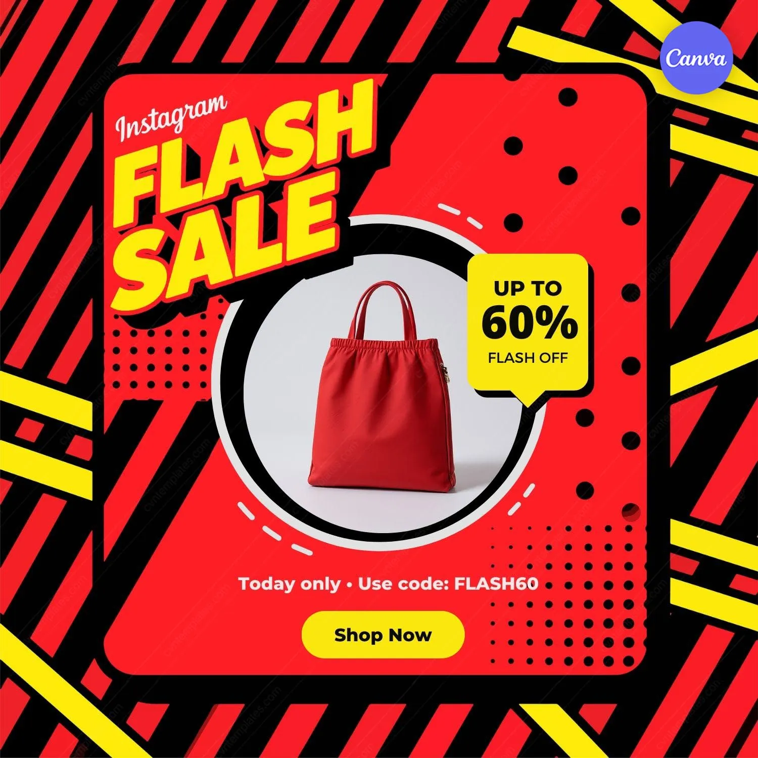 Grab attention instantly with this free flash sale Instagram template featuring a bold red and yellow pop art design. This free flash sale Instagram template showcases a striking color scheme with black polka dots and diagonal stripes creating an eye-catching pop art aesthetic. A red handbag is prominently displayed in a circular frame with a yellow speech bubble announcing “UP TO 60% FLASH OFF.” The retro-inspired typography and design elements create visual excitement that stops scrollers. Includes promo code “FLASH60” and “Shop Now” button for immediate conversions. The energetic, high-impact design is perfect for fashion accessories, handbag retailers, and brands wanting to create urgency with bold visual marketing on social media.