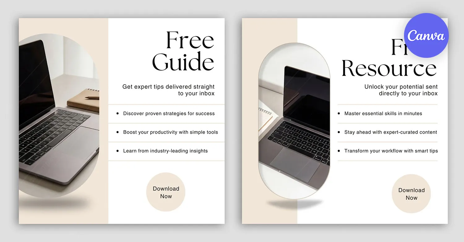 The “Free Guide” template emphasizes expert tips delivery with three compelling benefits including proven strategies, productivity tools, and industry insights. The “Free Resource” template focuses on skill development and workflow transformation. Each design includes strategic bullet points and a prominent “Download Now” call-to-action. Perfect for content marketers, business coaches, and service providers building their email list while providing genuine value to their audience.