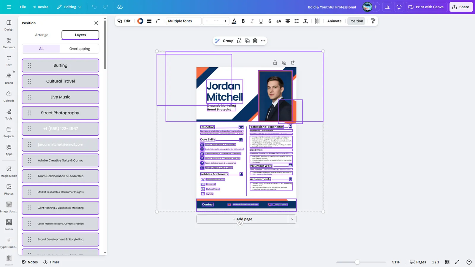 Make your mark with this free marketing student resume template designed for Canva users. The bold navy blue and orange color scheme with geometric accents creates an energetic, youthful aesthetic perfect for emerging marketing professionals. The layout features a stylish script name header, education credentials, icon-based core skills covering brand development, social media strategy, and event planning. Sections for professional experience, internships, volunteer work, and achievements with award icons demonstrate well-rounded involvement. Hobbies and interests add personality to your profile. The clean contact footer with email and phone completes this comprehensive template. Ideal for brand interns and entry-level marketing professionals.