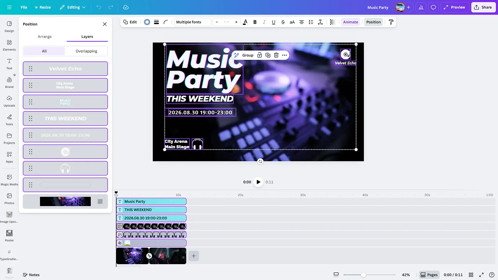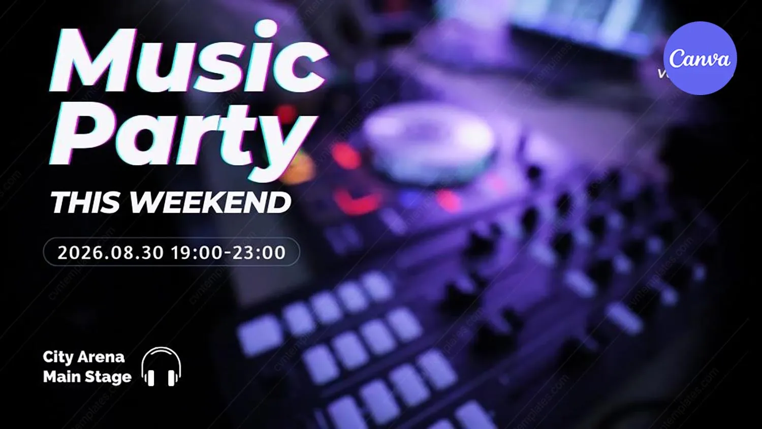 Get the party started with this vibrant free Music Party video template for Canva. Featuring a professional DJ setup with mixing console bathed in atmospheric purple lighting, this template captures the energy and excitement of live music events.
