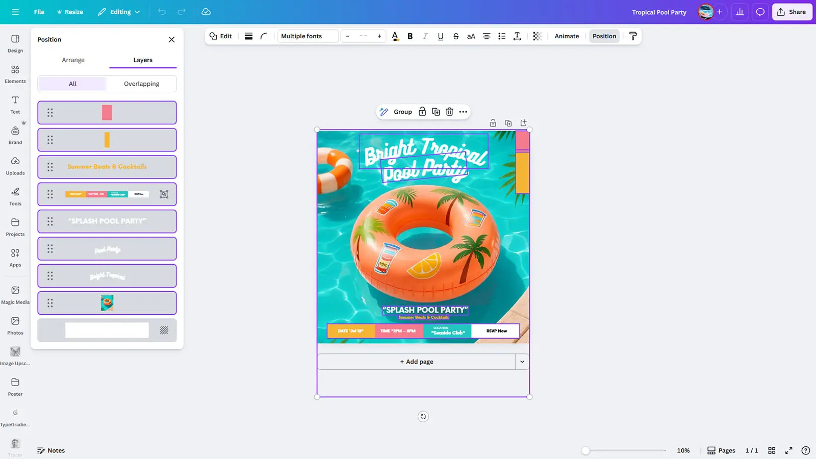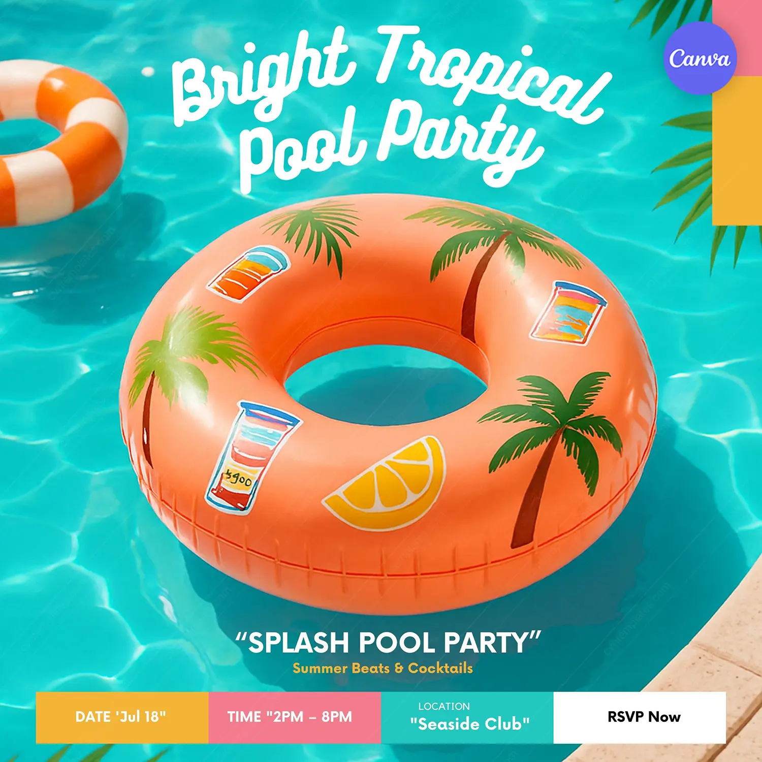 Looking for a free pool party poster template to make a splash with your summer event? This vibrant, tropical Canva design features a colorful pool float with palm tree designs in crystal blue water that screams fun in the sun. The template includes bright color accent blocks in pink, teal, and yellow, playful script typography, event date and time, venue location, and RSVP button. Perfect for pool parties, summer celebrations, beach club events, and tropical themed gatherings.