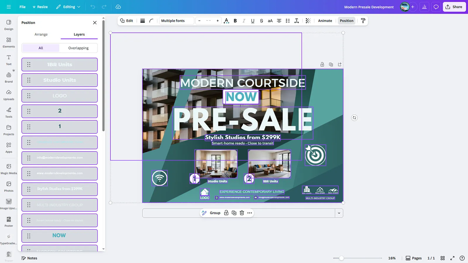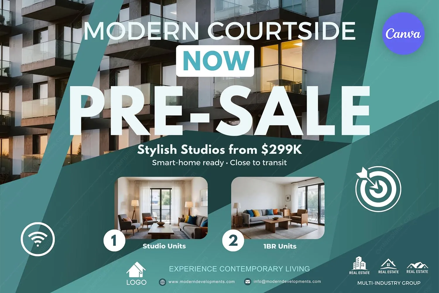 This free pre-sale real estate flyer template helps you launch new property developments with professional marketing impact. Designed for Canva, this contemporary template features a bold teal color scheme with dynamic diagonal design elements, showcasing modern apartment buildings and stylish interior spaces. Perfect for property developers, real estate marketers, and new construction sales teams promoting pre-sale condos, studio apartments, and smart-home ready units. The landscape layout strategically displays starting prices, unit type options, and professional branding areas with website and email contact information to generate qualified leads.