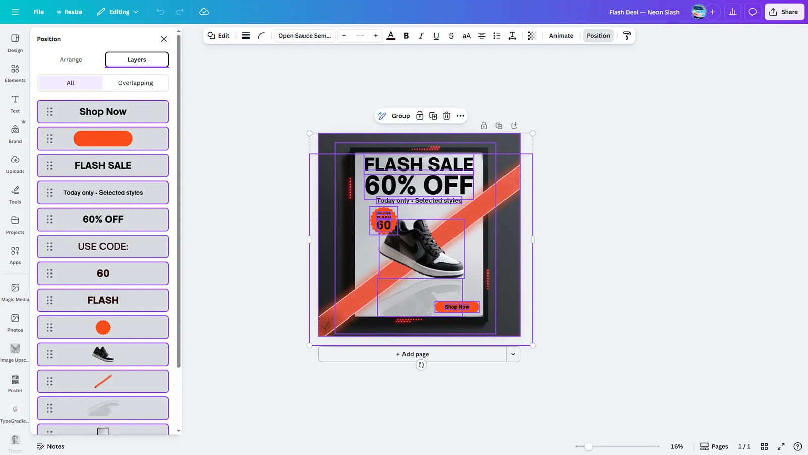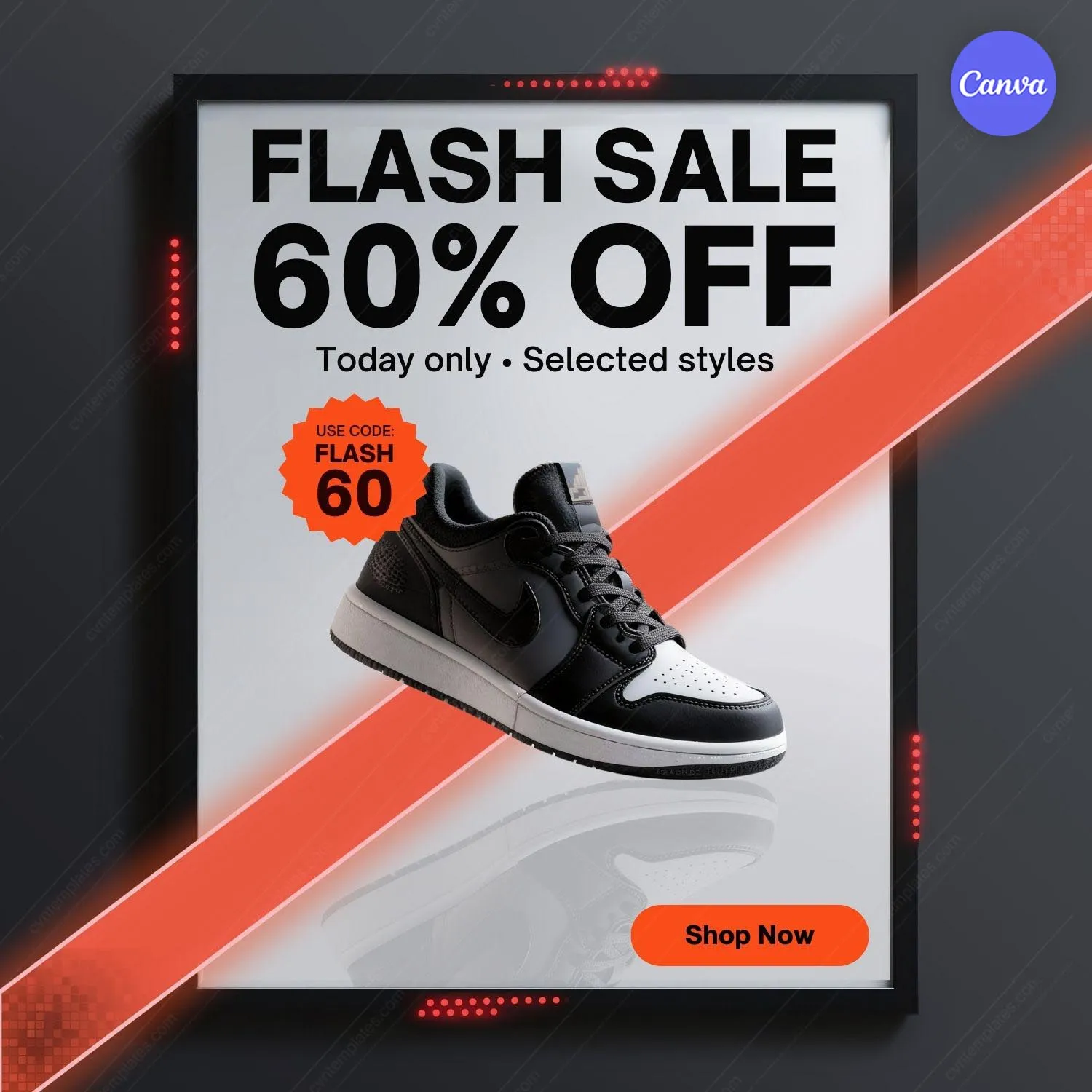 Create urgency with this free sneaker sale Instagram template featuring a dynamic black and orange flash sale design. This free sneaker sale Instagram template showcases a bold black background with red diagonal stripe accents creating a sporty, high-energy feel. LED-style lights frame the top edge for added visual impact and modern appeal. The featured black sneakers are prominently displayed with an orange starburst badge showing “USE CODE: FLASH60.” Bold typography announces “60% OFF – Today only • Selected styles” with a clear “Shop Now” button that drives conversions. The modern athletic aesthetic is perfect for sneaker stores, sports retailers, streetwear brands, and footwear e-commerce businesses.