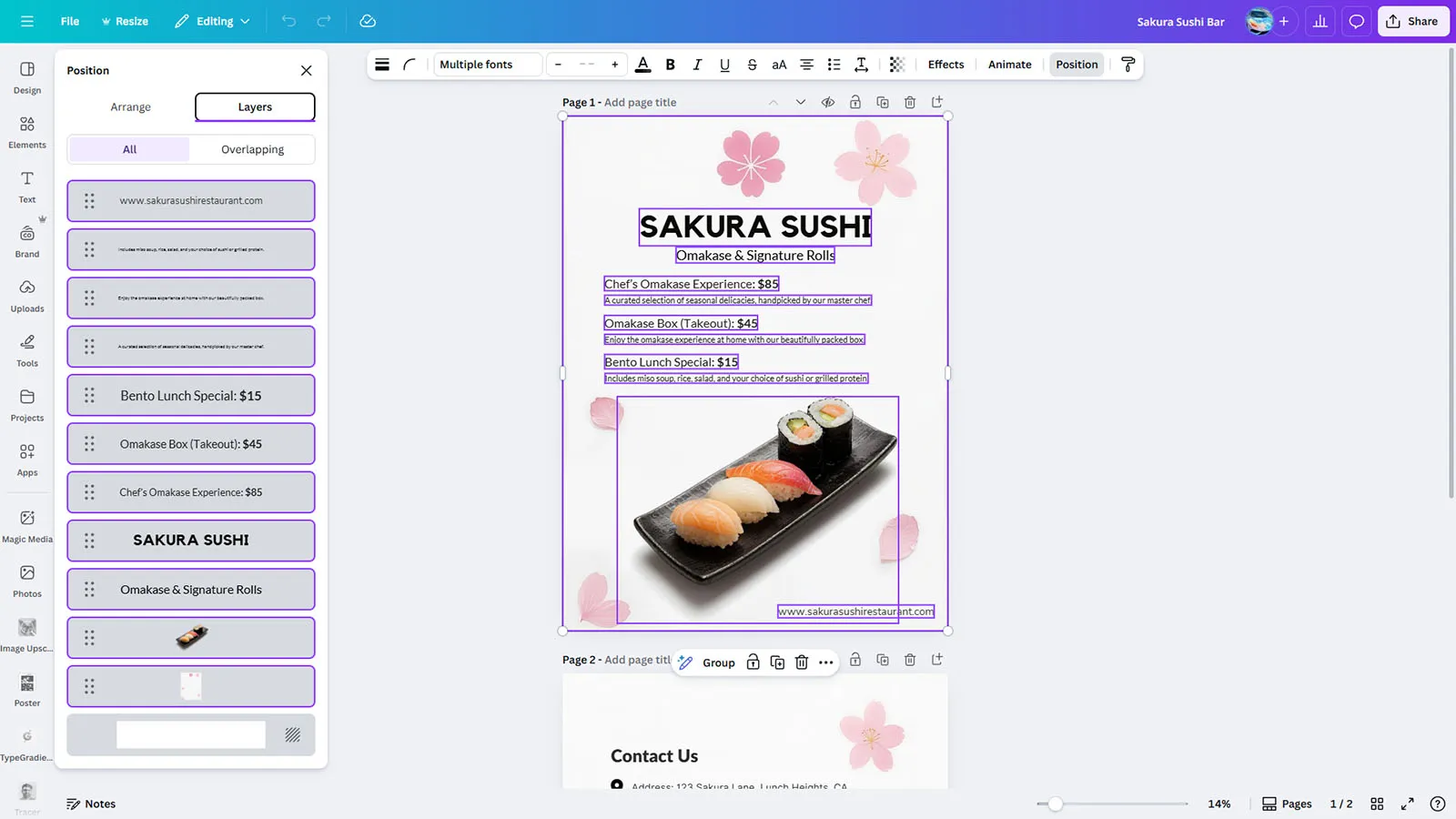 This free sushi restaurant flyer template presents Japanese cuisine with elegant minimalist beauty that attracts diners. Designed for Canva, this refined template features delicate cherry blossom petals, minimalist white background, and beautiful sushi photography on a black serving plate. Perfect for sushi restaurants, Japanese eateries, and omakase dining establishments promoting signature rolls and chef’s experience menus. The two-panel layout professionally displays menu pricing for omakase experiences and bento specials, complete contact information, business hours, social media handles, and QR code for reservations and full menu viewing.