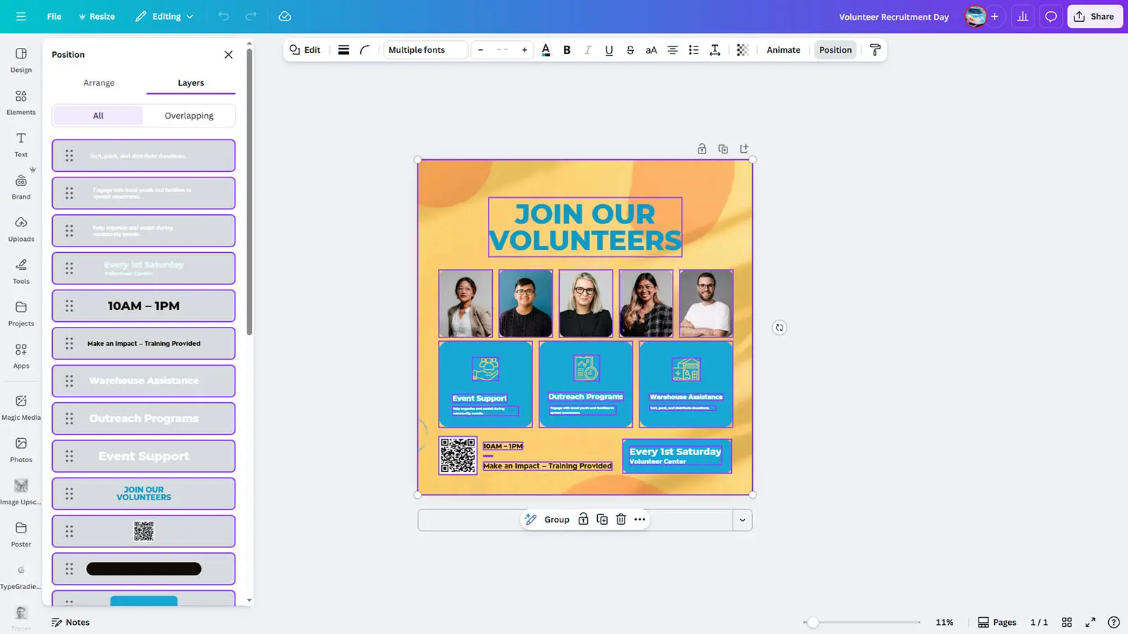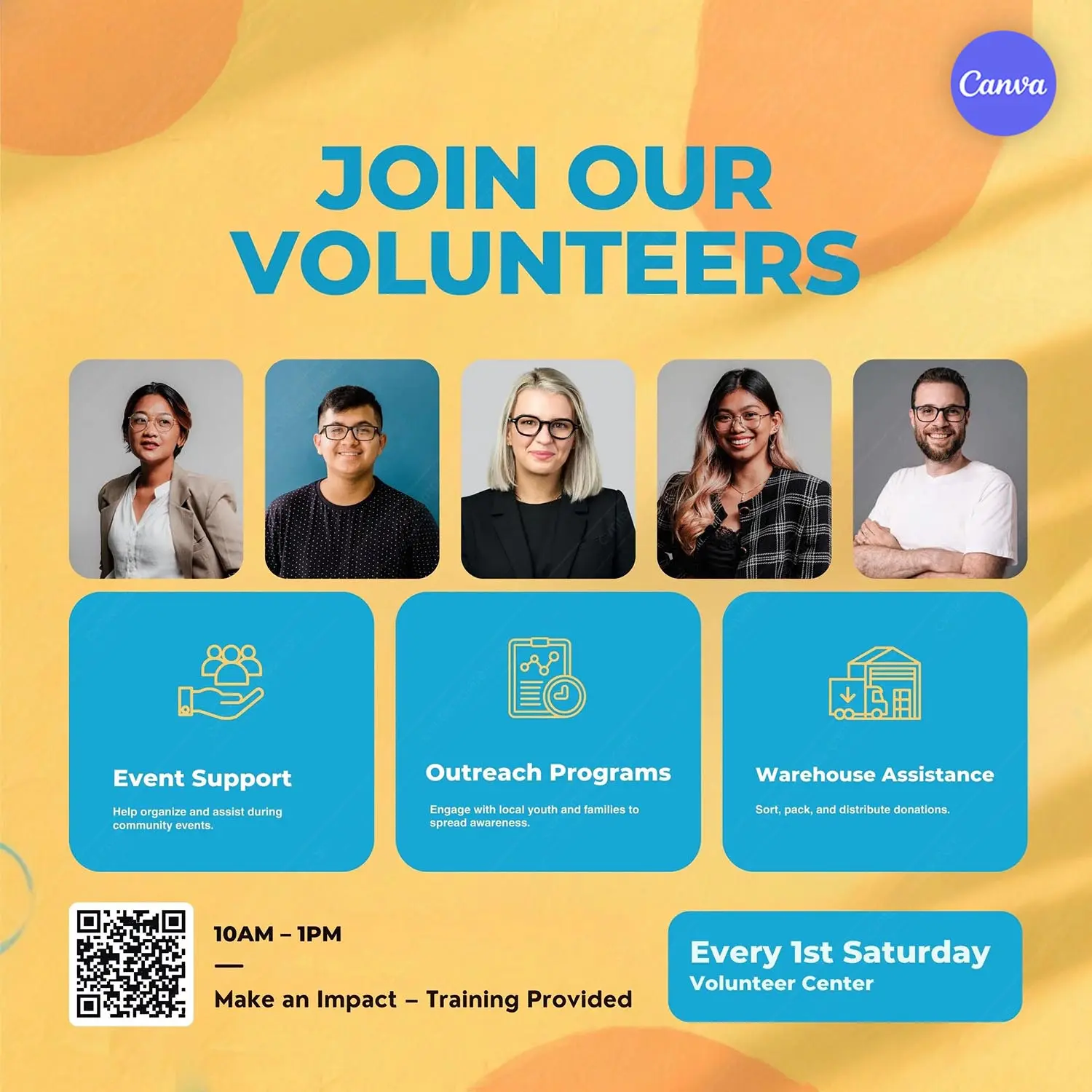 Looking for a free volunteer recruitment poster template to rally community support? This bright, welcoming Canva design features a cheerful yellow and orange gradient background with cyan accent boxes that radiate positivity and inclusivity. The template showcases diverse volunteer photos, three main program areas with descriptive icons, QR code for easy sign-up, and clear event schedule. Perfect for nonprofit organizations, community centers, volunteer coordination programs, and charity recruitment campaigns.