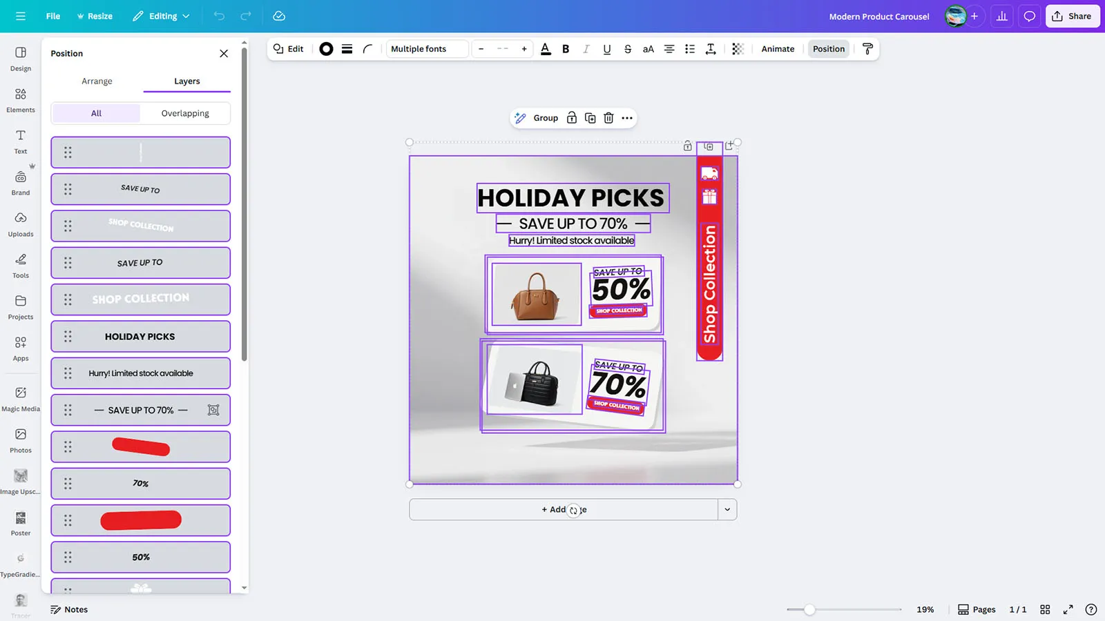 Showcase your seasonal deals with this clean and elegant holiday sale Instagram template featuring a minimalist shopping design. The template displays a soft gray gradient background with product showcase cards highlighting different discount tiers including 50% and 70% off. A red Shop Collection banner adds a pop of color and clear call-to-action. This holiday sale Instagram template includes product images with individual Shop Collection buttons and the urgency message Hurry! Limited stock available. Perfect for fashion retailers, e-commerce stores, and holiday shopping promotions seeking a sophisticated, modern look that converts browsers into buyers.