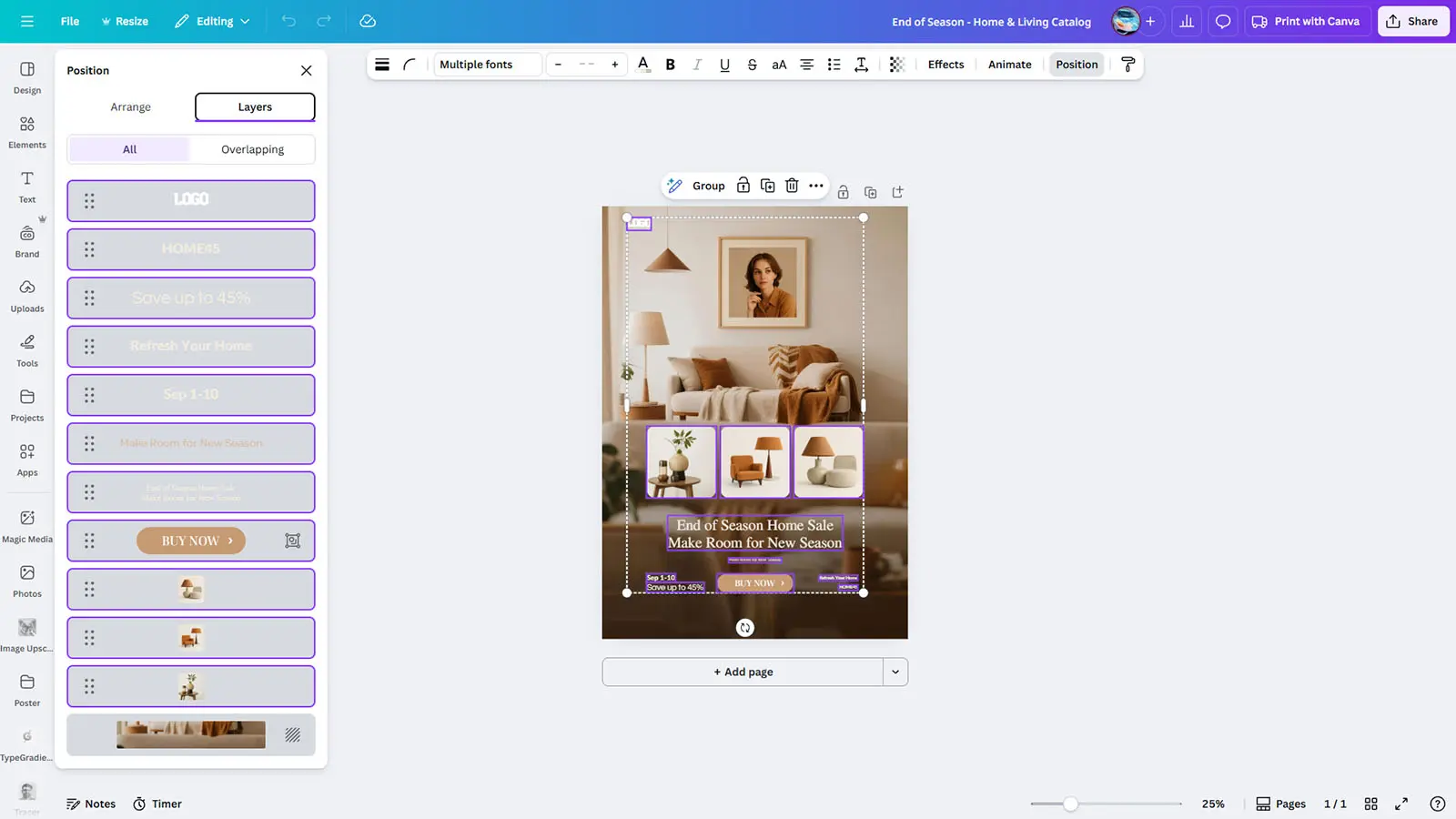 Looking for a home decor sale poster template to showcase your furniture promotion? This warm, inviting Canva design features a beautifully styled living room scene with product highlight cards that create aspirational appeal. The template includes featured furniture and decor items, discount percentage, sale dates, promo code, buy now button, and lifestyle messaging. Perfect for furniture stores, home decor sales, interior design promotions, and seasonal home clearances.