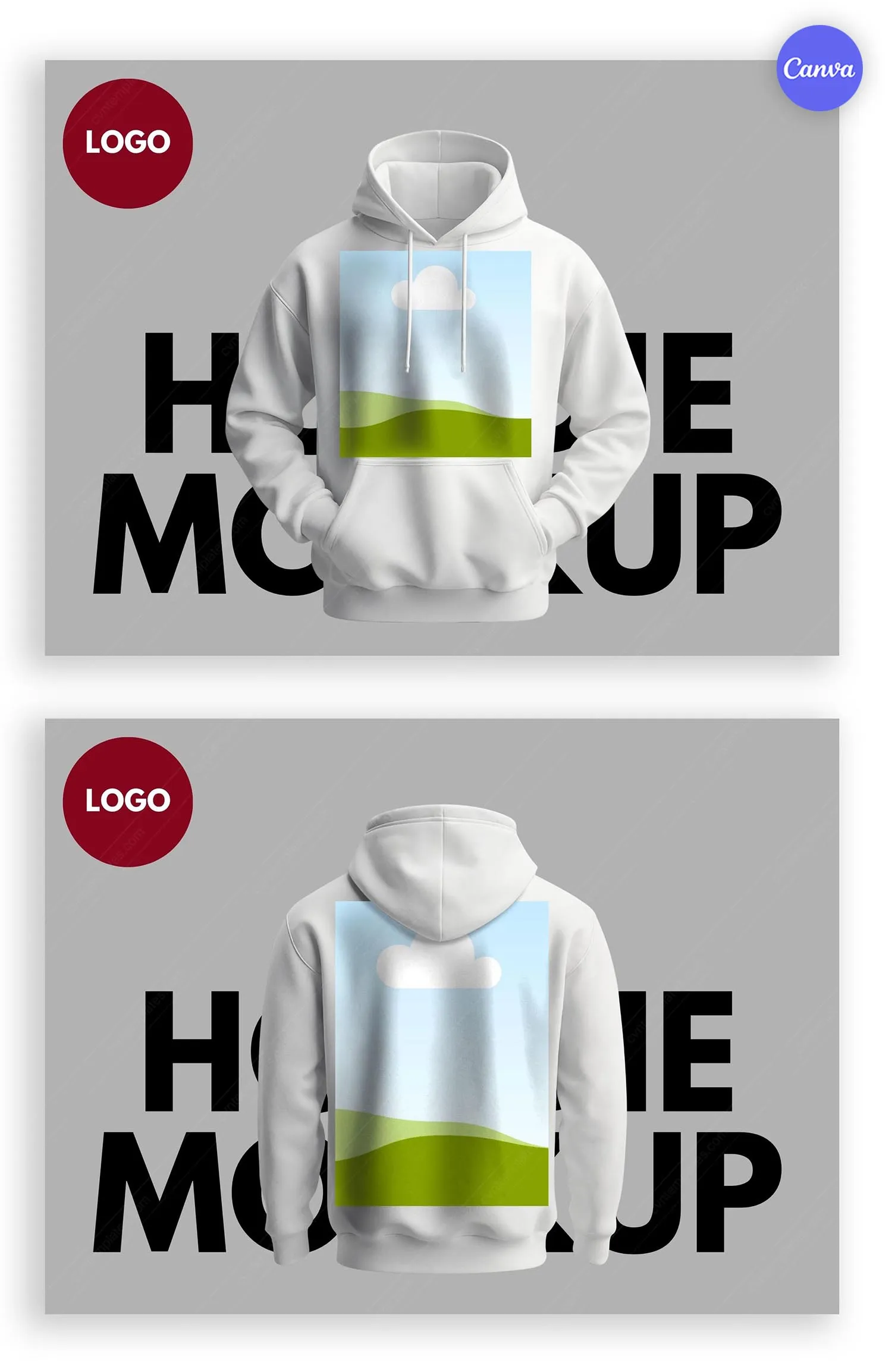 Searching for a professional hoodie mockup to display your designs? This comprehensive hoodie mockup template for Canva features both front and back views of a white hoodie on a gray background with bold typography. The dual-view layout shows both sides of your garment for complete design presentation.