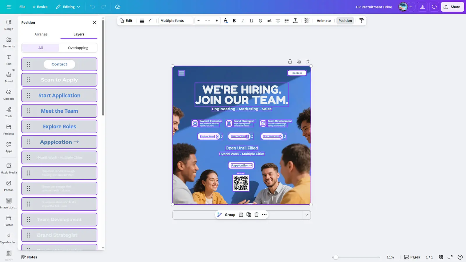 Need a job recruitment poster template to attract top talent? This dynamic, modern Canva design features a diverse team in a collaborative meeting environment against a vibrant blue background that communicates opportunity and teamwork. The template includes job role highlights with icons, department categories, multiple CTA buttons, hybrid work details, QR code for applications, and application button. Perfect for job fairs, corporate recruitment, hiring campaigns, and career opportunity promotions.