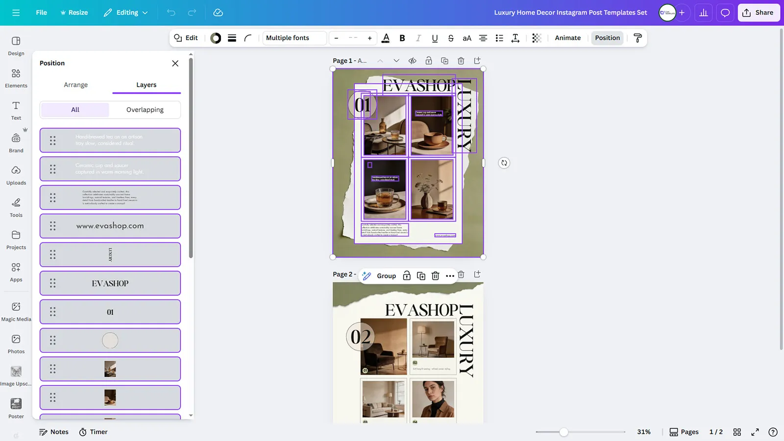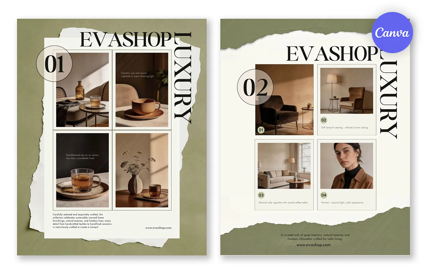 Discover this premium set of 2 Instagram post templates designed for luxury fashion and interior brands. The “EVASHOP LUXURY” collection seamlessly blends fashion aesthetics with sophisticated home decor imagery, creating a unique narrative that appeals to lifestyle-conscious audiences. Each template features a distinctive olive-green torn paper border effect, cream backgrounds, and carefully curated photo grids showcasing coffee tables, ceramic pieces, and cozy interior moments.