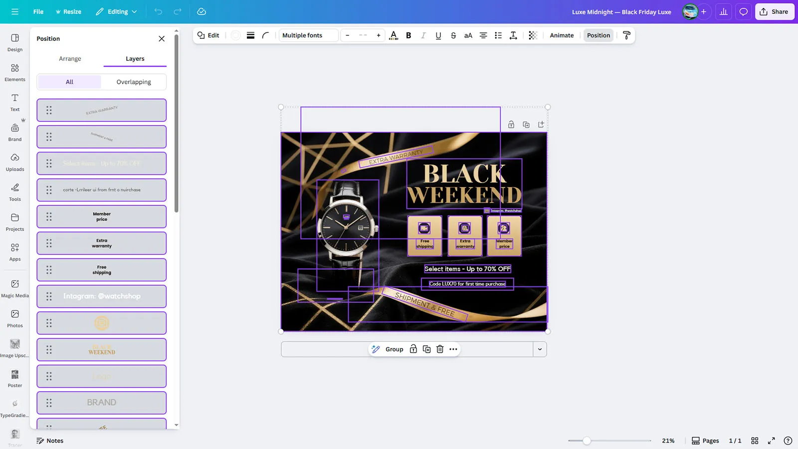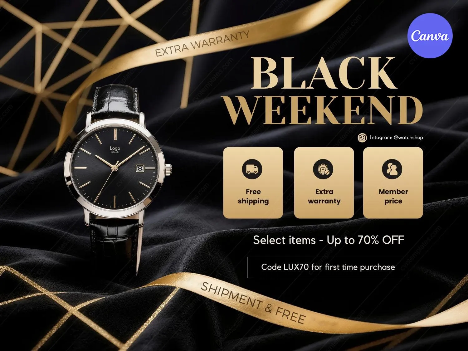 Showcase premium products with this sophisticated luxury watch sale Instagram template featuring elegant black and gold design. This luxury watch sale Instagram template displays an exquisite timepiece against a black silk background with golden ribbon accents and geometric line patterns. Three feature cards highlight key benefits: Free Shipping, Extra Warranty, and Member Price. The gold typography announces “Up to 70% OFF” with promo code “LUX70 for first time purchase.” A golden banner at the bottom reinforces free shipment benefits. The luxurious black and gold palette exudes exclusivity and premium branding. Perfect for watch retailers, jewelry stores, luxury accessory brands, and Black Friday promotions on social media.