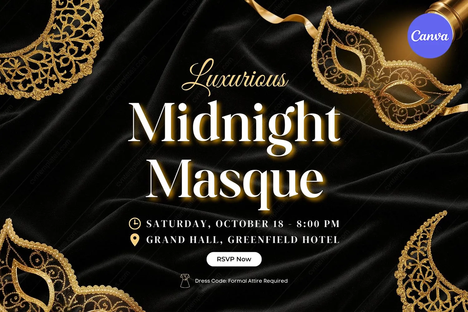 This masquerade ball flyer template creates an air of mystery with luxurious elegance that captivates guests. Designed for Canva, this sophisticated template features elegant gold venetian masks on rich black velvet fabric, creating an opulent atmosphere perfect for formal masquerade parties. Ideal for event planners, hotels, and venues hosting elegant costume balls, gala events, and formal celebrations. The wide landscape format professionally displays event date, time, venue details, dress code requirements, and RSVP call-to-action. The stunning gold typography and decorative mask elements create a premium feel that elevates upscale events.