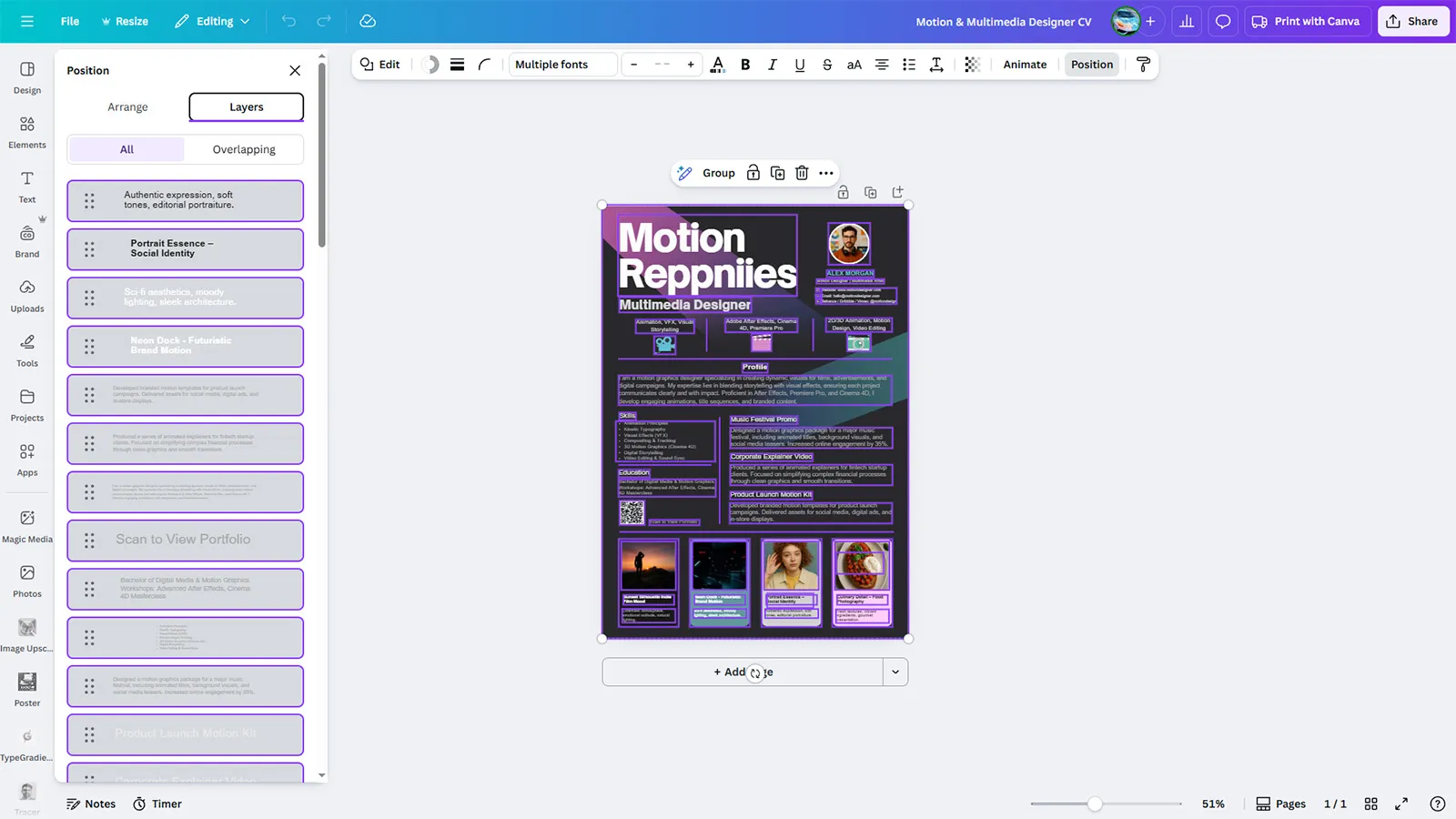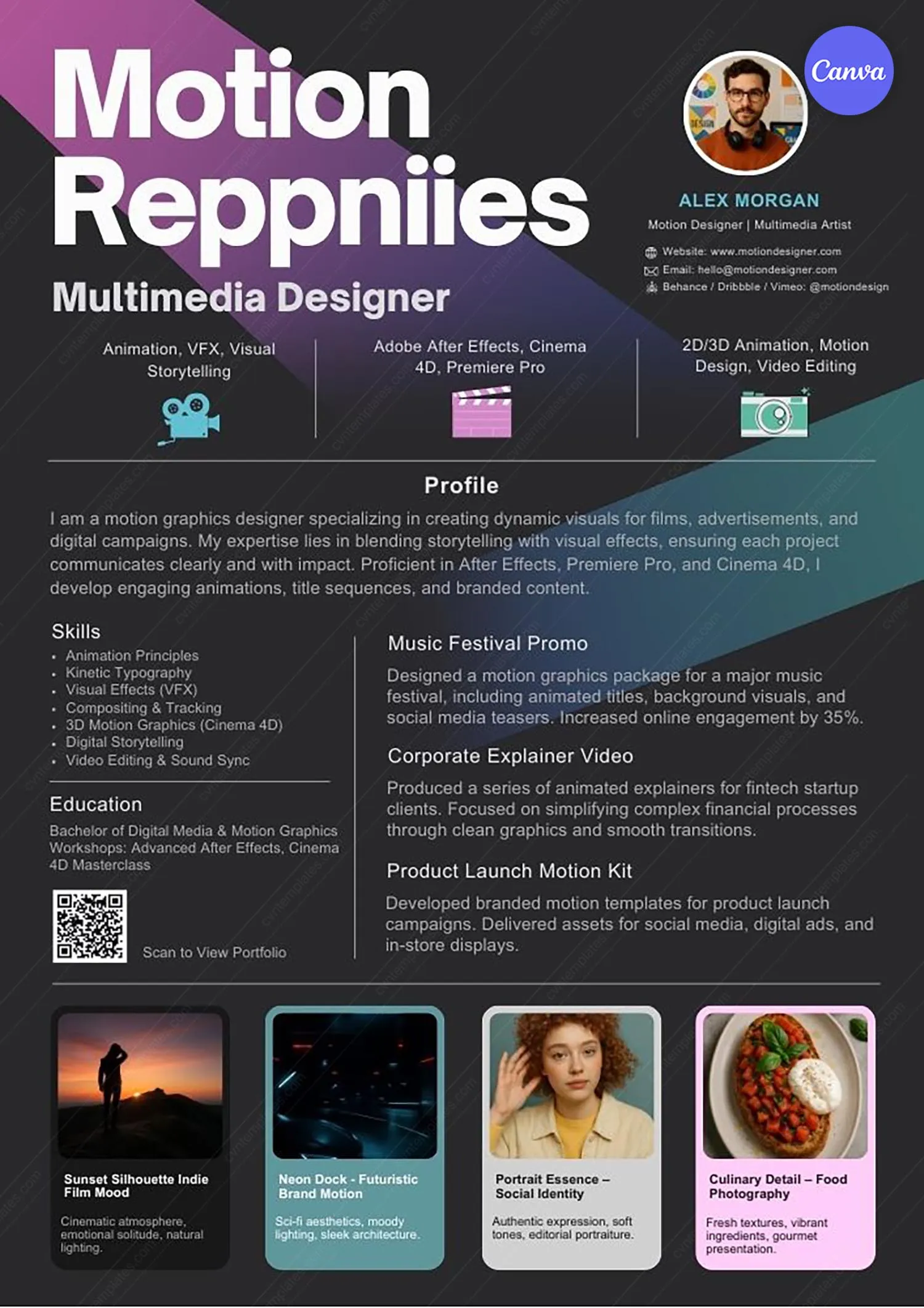 Capture attention with this dynamic motion graphics resume template designed specifically for Canva users. The bold dark background with vibrant gradient accents in purple, pink, and blue mirrors the creative energy of professional motion design work. This template includes dedicated sections for animation skills, education credentials with QR code portfolio link, and featured project descriptions. A stunning visual gallery at the bottom showcases your best work samples. Ideal for motion designers, VFX artists, video editors, and multimedia professionals pursuing careers in entertainment, advertising, or digital media industries.