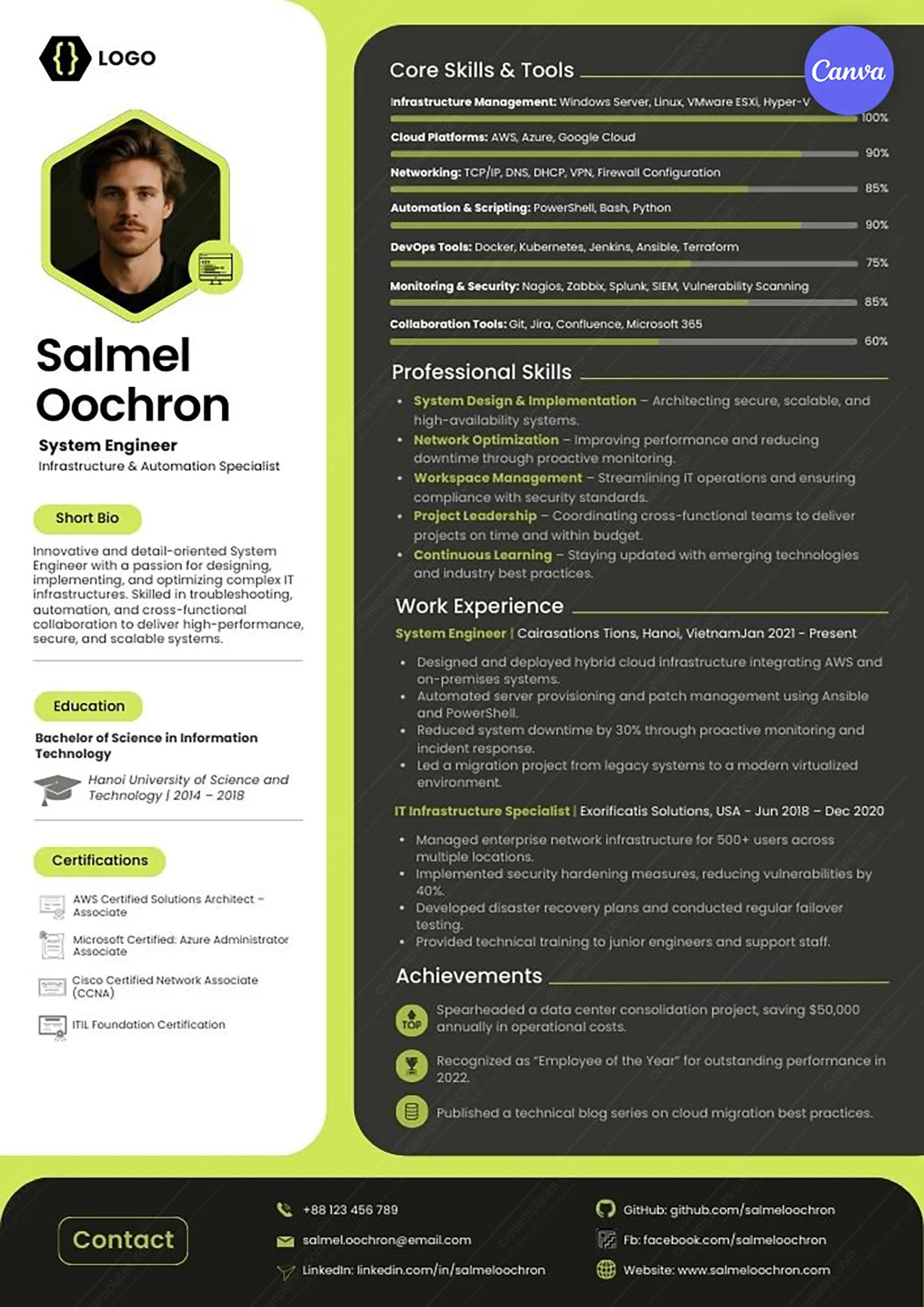 Showcase your infrastructure expertise with this striking system engineer resume template designed for Canva. The bold black and lime green color scheme creates a distinctive tech-forward aesthetic that stands out. The layout features comprehensive core skills and tools bars covering infrastructure management, cloud platforms, networking, automation scripting, and DevOps tools. Professional skills are presented with detailed descriptions, while the work experience section highlights hybrid cloud implementations and system optimization achievements. The achievements section with trophy icons showcases measurable impacts like cost savings. Complete contact footer with GitHub and LinkedIn integration. Perfect for infrastructure specialists and DevOps professionals.
