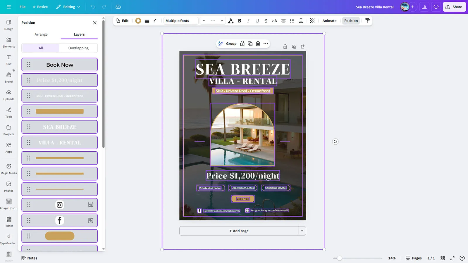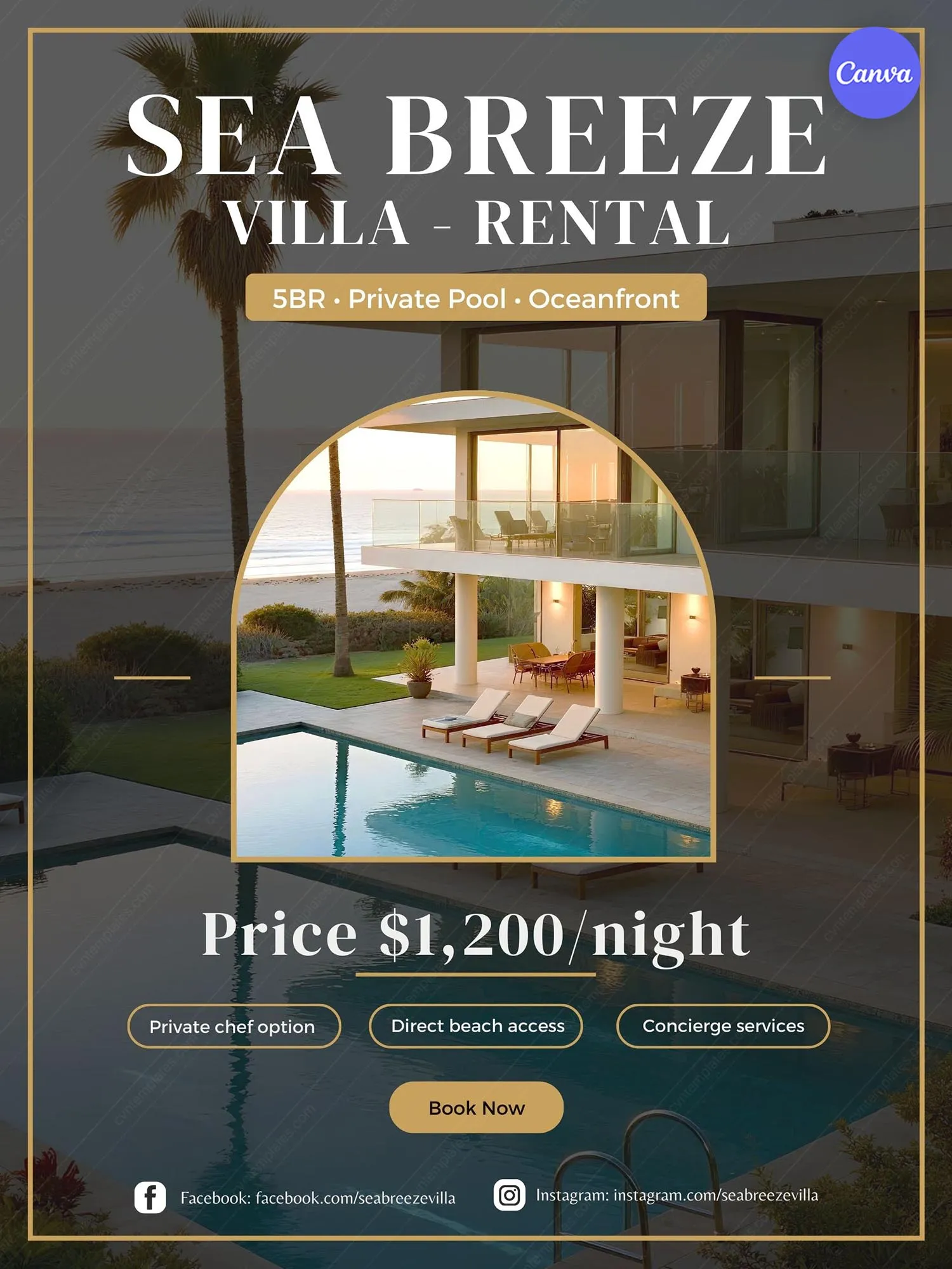 This vacation rental flyer template transforms your beachfront property marketing with stunning visual appeal. Designed for Canva, this elegant template features a sophisticated dark teal and gold color scheme, palm tree silhouettes, and a circular frame showcasing oceanfront property with private pool views. Ideal for vacation rental owners, Airbnb hosts, and property managers promoting luxury beach villas, coastal homes, and resort-style accommodations. The professionally crafted layout includes nightly pricing, bedroom count, premium amenities like private chef and concierge services, plus social media links for easy booking conversions that maximize your occupancy rates.