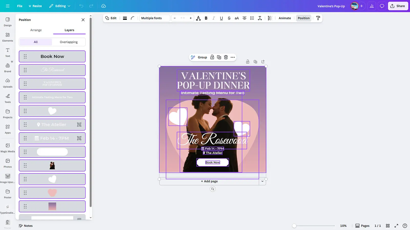 Searching for a Valentine’s Day dinner poster template to create the perfect invitation for your romantic celebration? This elegant, love-themed Canva design features a beautiful couple in an intimate embrace against a soft purple and pink gradient with heart accents that radiate romance and sophistication. The template includes elegant script restaurant name, event date and time, venue location, and book now button. Perfect for Valentine’s dinners, romantic pop-up events, couple’s tasting menus, and special date night promotions.