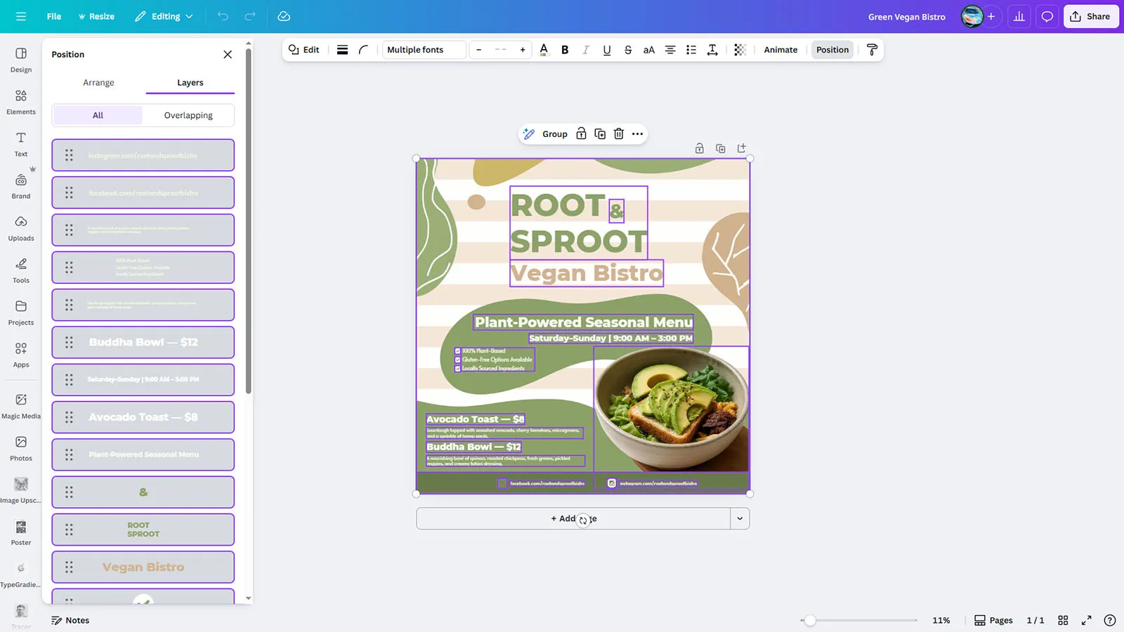 This vegan restaurant flyer template promotes healthy eateries with fresh organic appeal that resonates with health-conscious diners. Designed for Canva, this template features earthy green and beige tones with abstract botanical shapes, creating a natural plant-based dining atmosphere. Perfect for vegan restaurants, vegetarian cafes, and health-conscious eateries promoting seasonal menus and sustainable dining. The professionally crafted layout showcases plant-based credentials, gluten-free options, locally sourced ingredients highlights, plus featured menu items with prices and descriptions like avocado toast and buddha bowls. Social media footer included for customer engagement and online visibility.