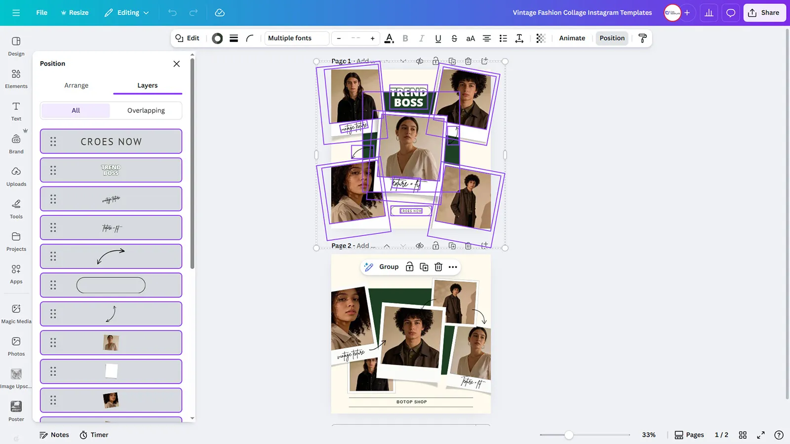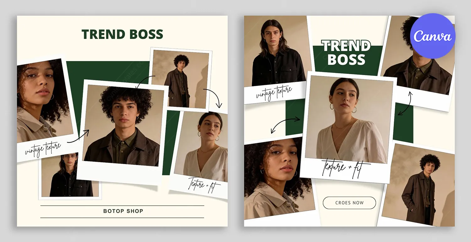 Make a bold statement with this dynamic set of 2 Instagram post templates featuring the “TREND BOSS” brand aesthetic. These Canva templates embrace vintage texture styling with a modern collage approach, perfect for fashion brands targeting trendsetting audiences. Each template combines multiple fashion portrait photographs arranged in an artistic, overlapping layout with forest green geometric accents and handwritten script annotations.