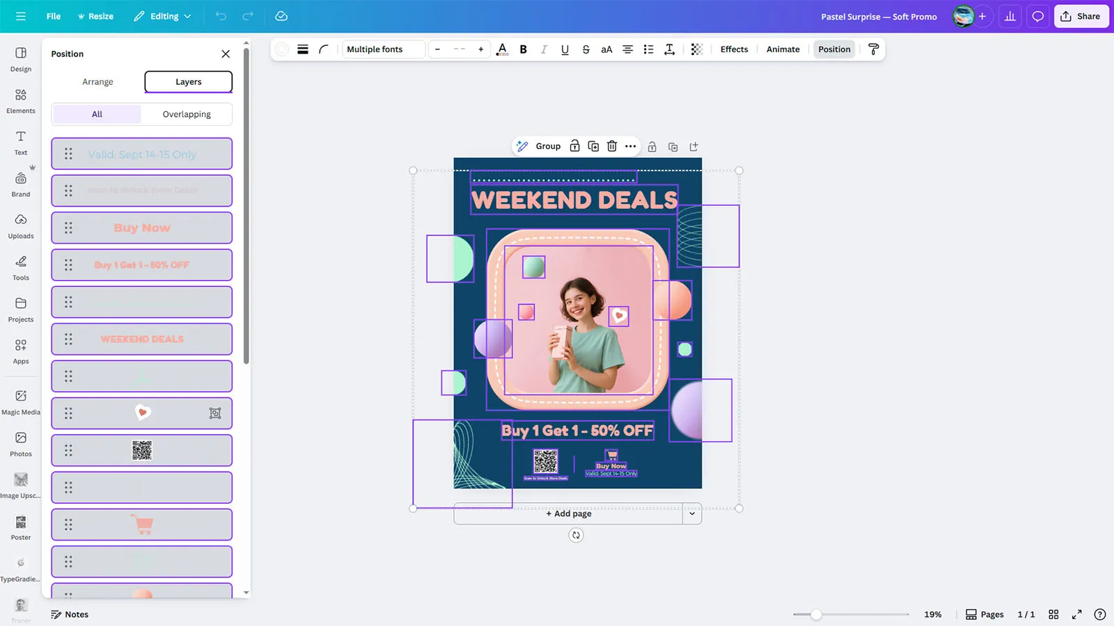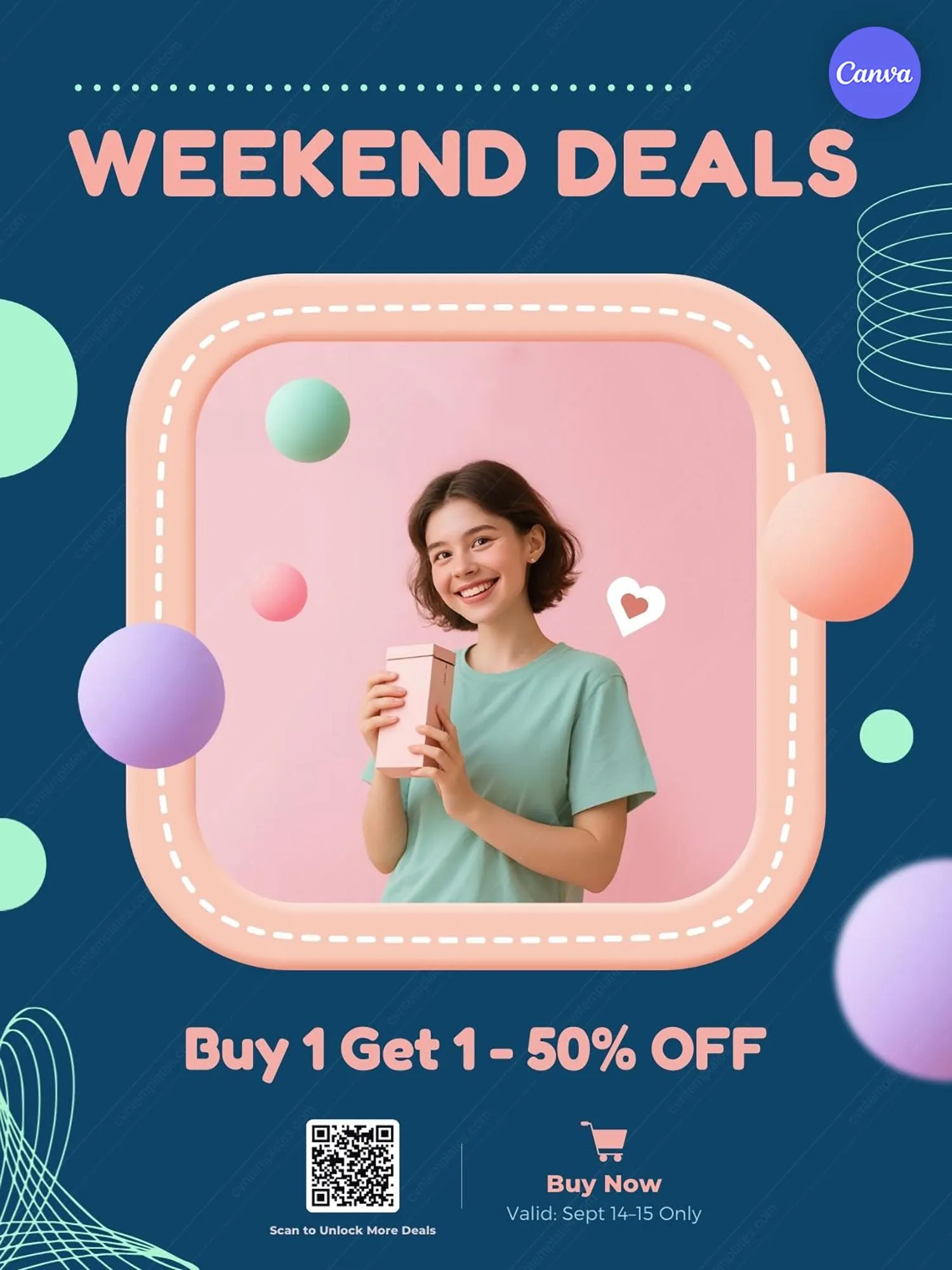 Attract weekend shoppers with this trendy weekend sale Instagram template featuring a fresh pastel design. This weekend sale Instagram template showcases a modern pastel color palette with soft pink, blue, and mint green floating circles against a navy blue background. A young woman in the center holds a product, elegantly framed by a rounded pink rectangle with dotted border. The playful typography announces “Buy 1 Get 1 – 50% OFF” with a QR code for unlocking more deals. A “Buy Now” button with validity dates creates urgency for your BOGO promotion. This youthful, trendy aesthetic is perfect for beauty brands, lifestyle products, skincare companies, and Gen-Z targeted marketing campaigns on social media.